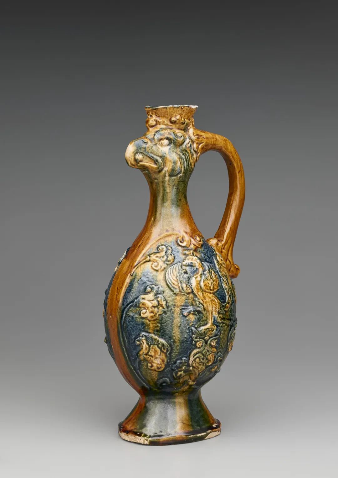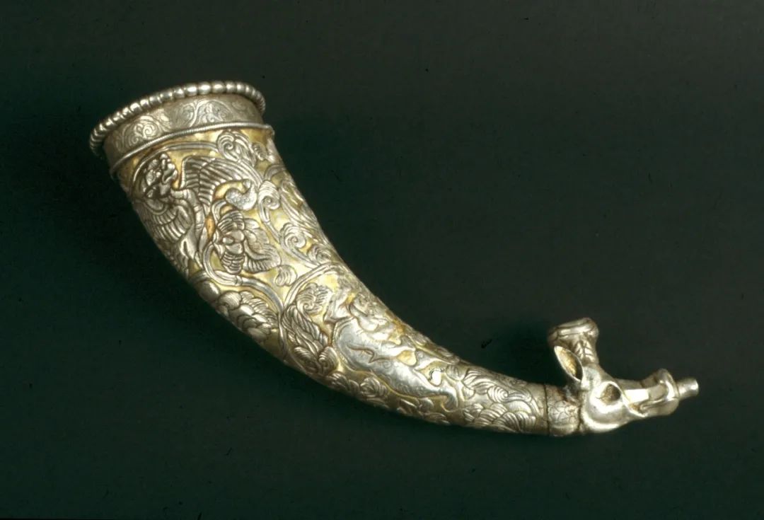 本单元重点展品之一为唐代凤首壶,此执壶有“把手”和“流口”,展示了胡人以倾注方式倒酒的饮俗,如何改变中原旧有以勺或斗斟酌的盛酒习惯。