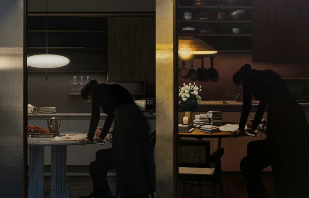 室内摄影师覃昭量表示,《此刻》系列中一幅场景为两个人物在橱柜前阅读的画作,是将他为客户拍摄的项目照片,直接“抄袭成画”。“张业兴的这幅作品和我的画相似度达到了90%。并且,从始至今张业兴都没有联系过我本人、我的客户或客户的业主进行版权授权。这样的侵权作品居然公开展览并售出,而且据说还卖了十几万元。”