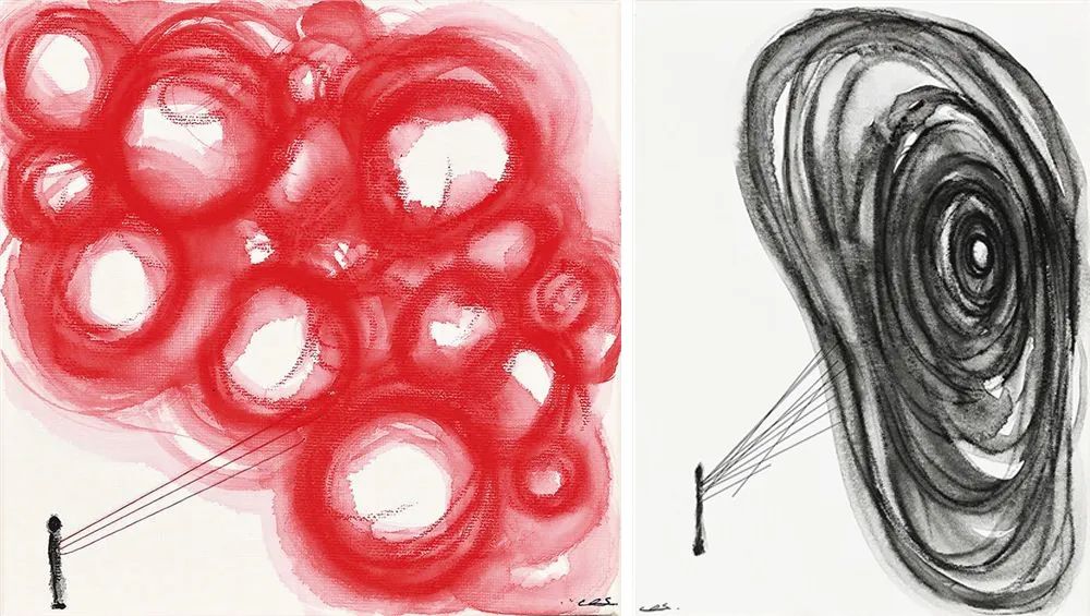 右:塩田千春《与宇宙的联系》,水溶性蜡笔、墨、线、纸本,20×20cm,拍卖成交价497,000港币