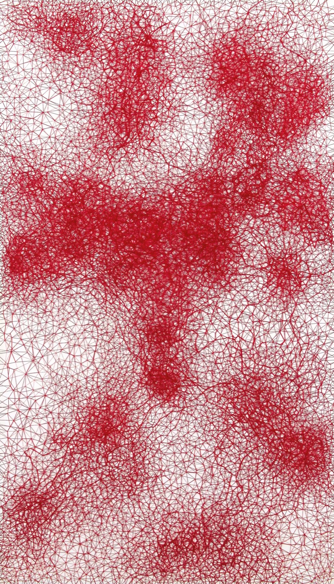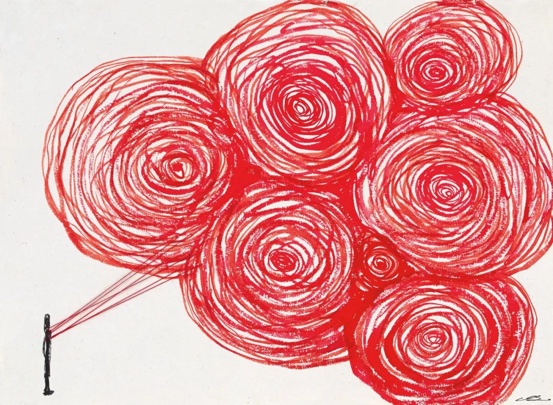 作品采用艺术家经典的红彩,当中以 6 股细线, 从左下靠近人体心脏的位置发出,通向 6 个大同心圆和 1 个正在形成的小同心圆。每个圆圈好似盛放的圆形洋牡丹,层层迭迭的花瓣向内包裹着花蕊,并极力地朝外怒放。其恰如同人心中的七情六欲,自红线延展而出,将生命缠绕成圈,并就此生生不息,展现生命的张力。
