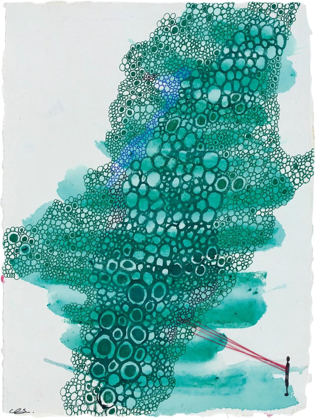 另一件完成于 2021 年的同名作品,则以绿彩铺展,以植物的生命颜色抒发其对宇宙星河的想象。画面中央可见一个个细小的圆圈,好似人体细胞,包裹着带有生命 DNA 基因的细胞核,不断繁衍生长。而 4 股自人物的胸膛放射出的红线,则宛如显微镜般,将最小的细胞结构成倍扩大于画幅,并由此带出另一宏观视角:图像若天上的繁星,不停闪烁着释放能量,并组成一条璀璨的星带,自上至下缓缓流淌出银河的梦幻。沾染绿彩的笔刷横向平扫,彷佛将右下角的人和星河置于同一水平线上,脚踏实地,只为仰望星空,并终而发现,自己便是那宇宙。