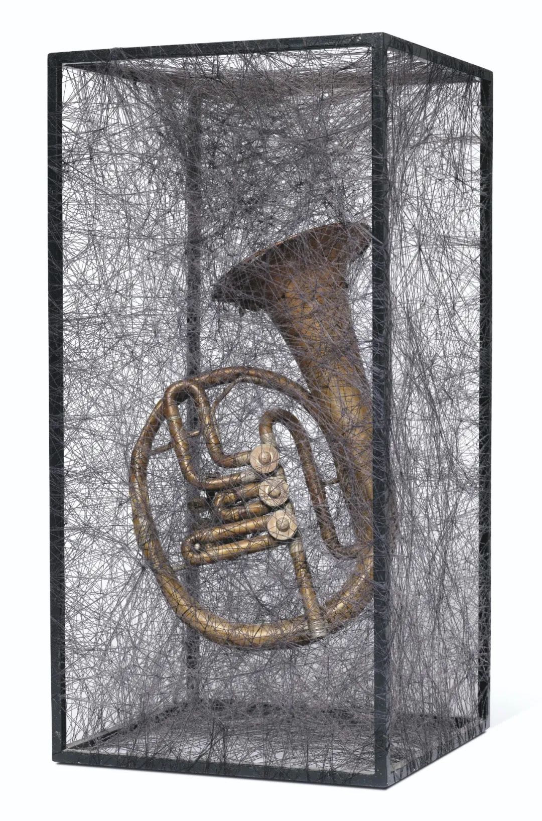 塩田千春《存在的状态》,黑线、铁架雕塑、圆号,60×30×30cm,拍卖成交价1,375,000港币
