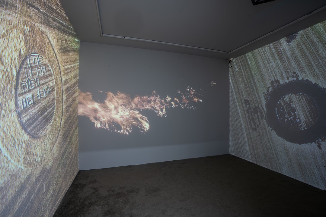 在这次展览中,展示了刘旭光最新的影像作品《墨目》。2024年底,刘旭光在黄河娘娘滩现场制作了一个巨大的圆形枯墨池,一个箭头拖着长长的直线插入墨池。通过运用黄河水与墨汁构建出“墨瞳”独特意象,既呼应“民”字中的视觉凝视,又暗示了作者对历史与现实的深刻洞察。当从高处俯瞰作品时,映照出自然与天宇景观,仿佛是将古老的时空密码与蕴含的生命力而展开的无声对话。