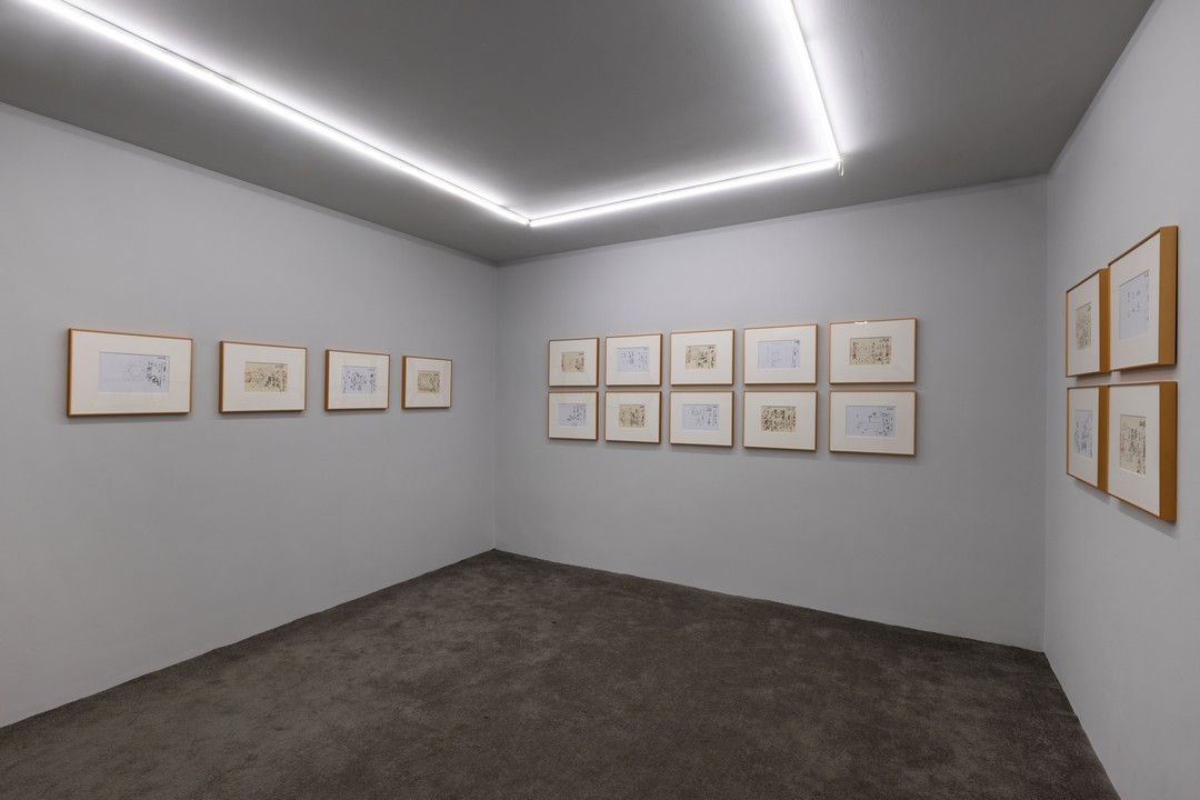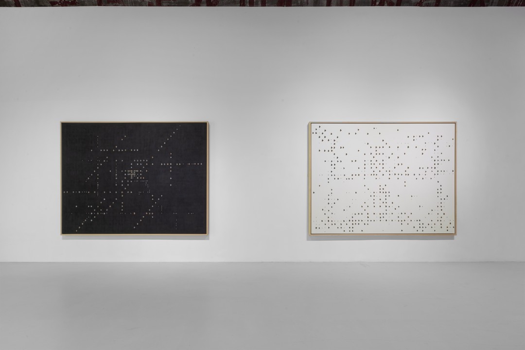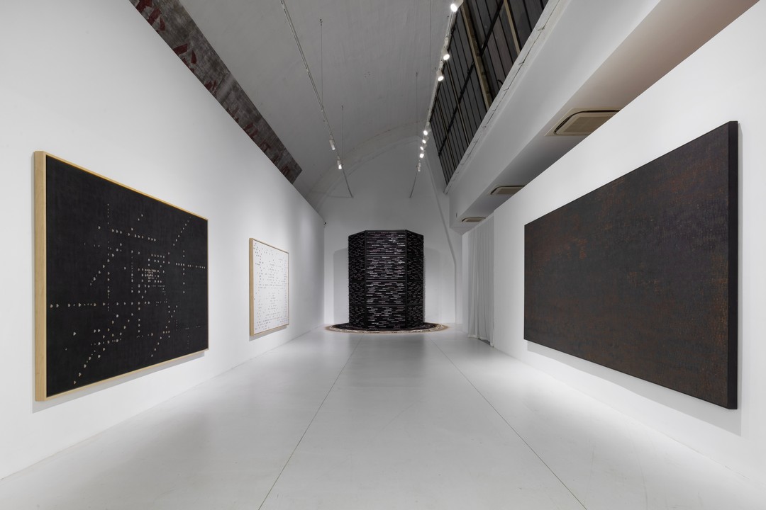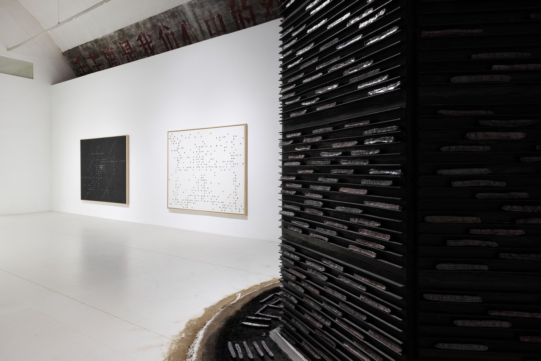 同时,刘旭光根据東京画廊+BTAP的空间结构,延伸了他最新的装置作品《墨塔》,抑或是一次时间与生命之塔的具象化呈现。艺术家将带有古代数字与时间数字的黑色磁条堆砌成一座六棱塔,其造型上的灵感取自梁思成绘画的塔截面草图,不仅具备形式上的美感,更蕴含着深层次的哲学思考,引发对《易经》、河洛数字概念的深入思考,诉说着人类对宇宙、时间和生命的认知,象征着时间的流转、生命的轮回。