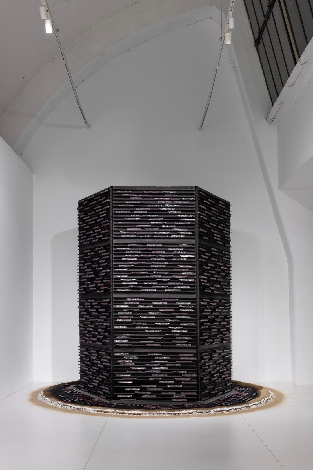 墨塔 Ink Tower,2025,H360x400cm,装置:木材、瓷条、墨、黄河沙土等 Installation:Wooden materials、Porcelain strips、Ink、Sand from Yellow River