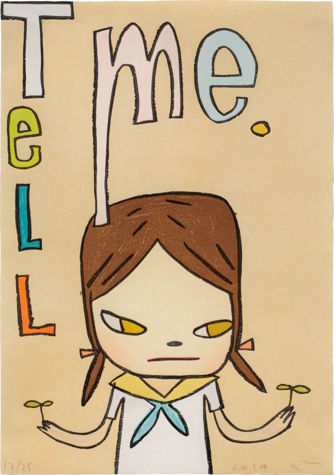 本次拍卖中,奈良美智的《告诉我》延续了艺术家标独特的视觉符号。画面中,奈良女孩标志性的杏仁状双眼微侧凝视,狡黠笑意在稚拙线条间流转,将孩童的天真与叛逆凝结为极具辨识度的象征。