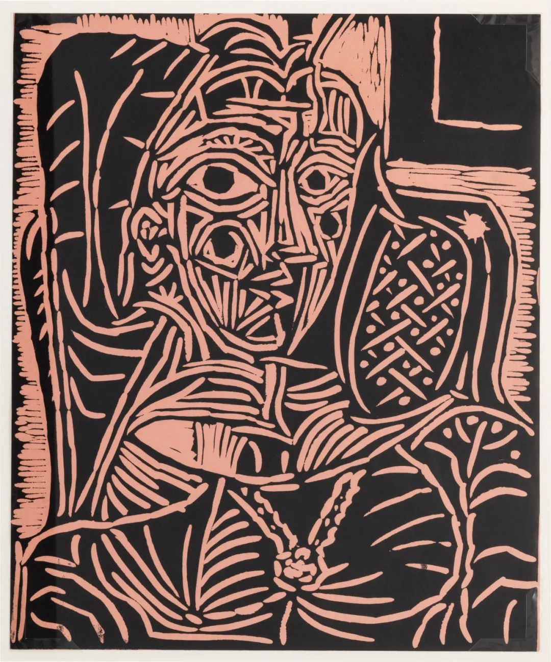 这幅肖像作品以艺术家晚年缪斯、第二任妻子杰奎琳·洛克(Jacqueline Roque)为原型,通过几何化变形与多重视角解构,这幅作品彰显了毕加索立体主义时期对人物肖像本质解构与重构的造型实验,突显其独特捕捉艺术的手法。作为毕加索创作高峰期反复演绎的主题,此作不仅凝结着对伴侣的炽热情感,更成为贯穿其晚期艺术生涯、最具规模与延续性的创作母题。