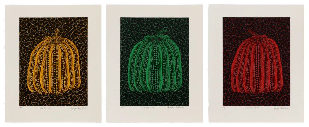 本次拍卖特别呈现草间弥生创作于1980年代的三联作《南瓜(YT)》《南瓜(GT)》《南瓜(RT)》。黄、绿、红三色南瓜表面密布艺术家标志性的圆点图案,黑色无限网纹路在其间蜿蜒生长,延续了艺术家对这描绘这一主题的迷恋。