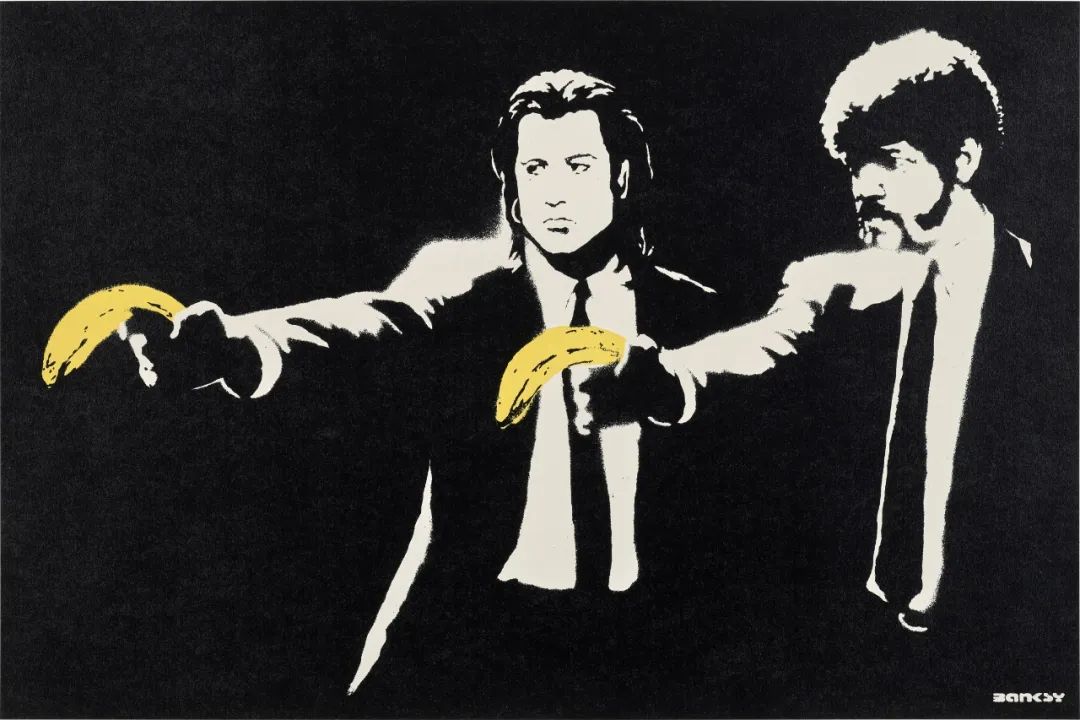本次拍卖中呈现的班克斯(Banksy)作品《低俗小说》,源自艺术家2002年在伦敦老街地铁站实施的游击创作。艺术家采用标志性的模板喷绘技术,将昆汀·塔伦蒂诺执导的电影《低俗小说》(1994)中约翰·特拉沃尔塔与乌玛·瑟曼举枪对峙的经典场景,转化为荒诞的香蕉枪械——这种视觉置换延续了班克斯对暴力娱乐化的尖锐批判。