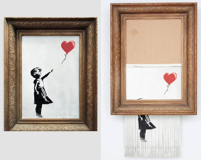 班克斯的《气球女孩》(左)在拍卖后被部分粉碎(右)