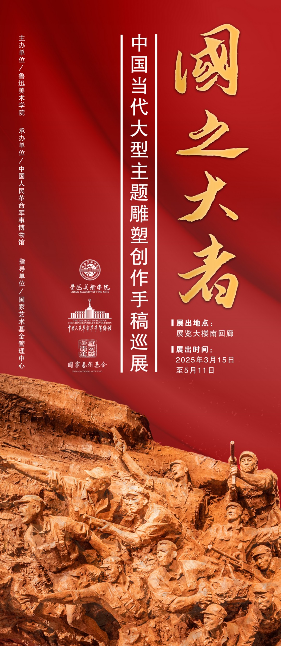 “国之大者”——中国当代大型主题性雕塑创作手稿巡展于2025年3月15日在中国人民革命军事博物馆开幕。展览由鲁迅美术学院主办,中国人民革命军事博物馆承办,系2024年度国家艺术基金文化交流推广资助项目。本次展览是深入贯彻习近平文化思想的具体举措,是全国美术工作者致力于红色革命题材主题创作的生动实践。展览通过雕塑艺术语言集中展示党的辉煌成就,讴歌革命先烈和英雄人物,展现人民群众的精神风貌。中国共产党历史展览馆《旗帜》、《信仰》、《伟业》、《攻坚》、《追梦》,中央党校《战友》以及军事博物馆《走向胜利》等一系列新时代以来创作的党、国家和军队大型主题雕塑创作手稿在此次展览中集体亮相。展览展出的雕塑作品手稿思想内涵深厚、艺术水平精湛,具有较好的展示研究及收藏利用价值。