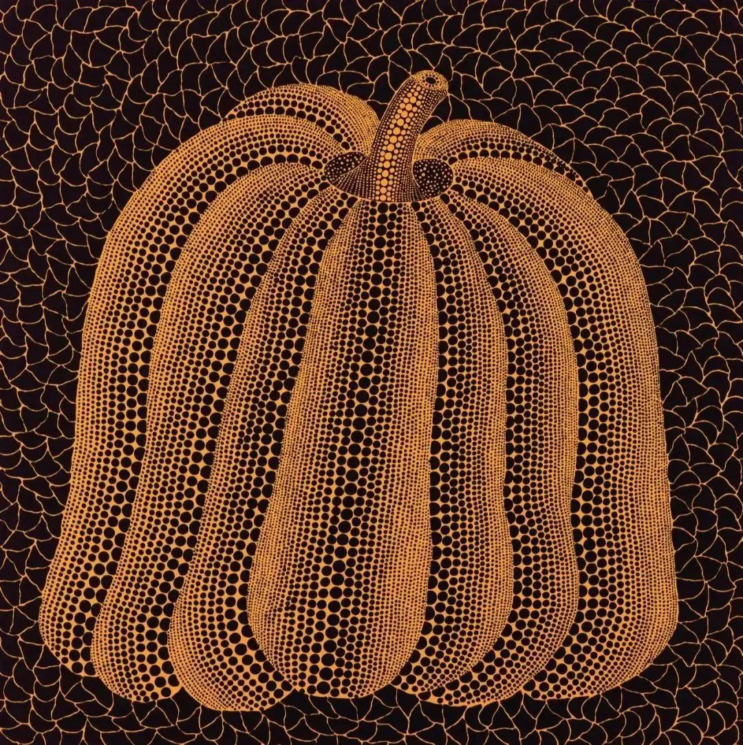 草间弥生以其标志性的圆点和南瓜形象闻名。《南瓜(HRU)》少见地绘制于正方形的画布,画面亦以其耀眼的黄色与密集而富有律动感的黑色圆点,象征了无限与永恒。