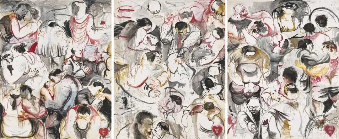 《亲密》是张恩利37岁时创作的一组尺幅巨大的三联画,画中28对亲密关系毫不掩饰地展现了人类亲密关系中的动物本能,在一定意义上是这个复杂得多的社会的亲密关系缩影。