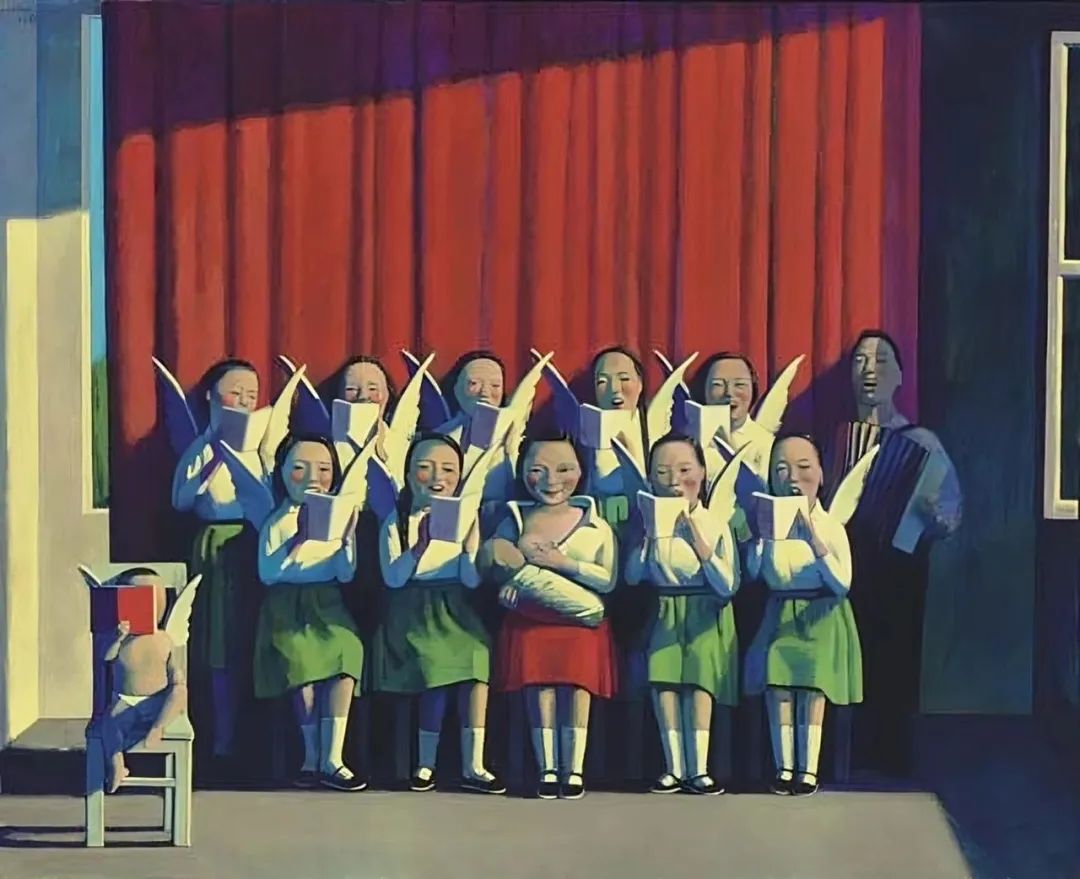 “红色帷幕”系列是刘野向雷尼·马格利特和乔治欧·德·基里诃的致敬之作,当中可见西方美学与中式主题的碰撞与融合。《北京圣母》见证艺术家透过国际化现代视角追寻对人性的普世理解。