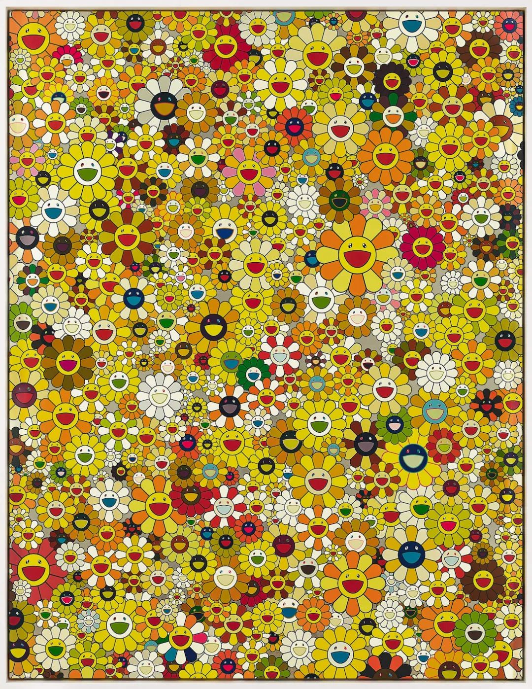 村上隆的微笑花朵在《向金色致敬 1960 E》中簇拥绽放,为一系列致敬法国概念艺术家伊夫·克莱因单色作品的创作之一。
