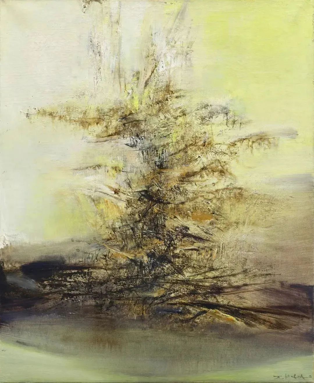 赵无极以狂草式的线条结构,在画面中构建出一种既狂放又富有秩序的视觉节奏。亮黄色与棕褐色纵横交错,营造出一种沉静而富有韵律的空间感。
