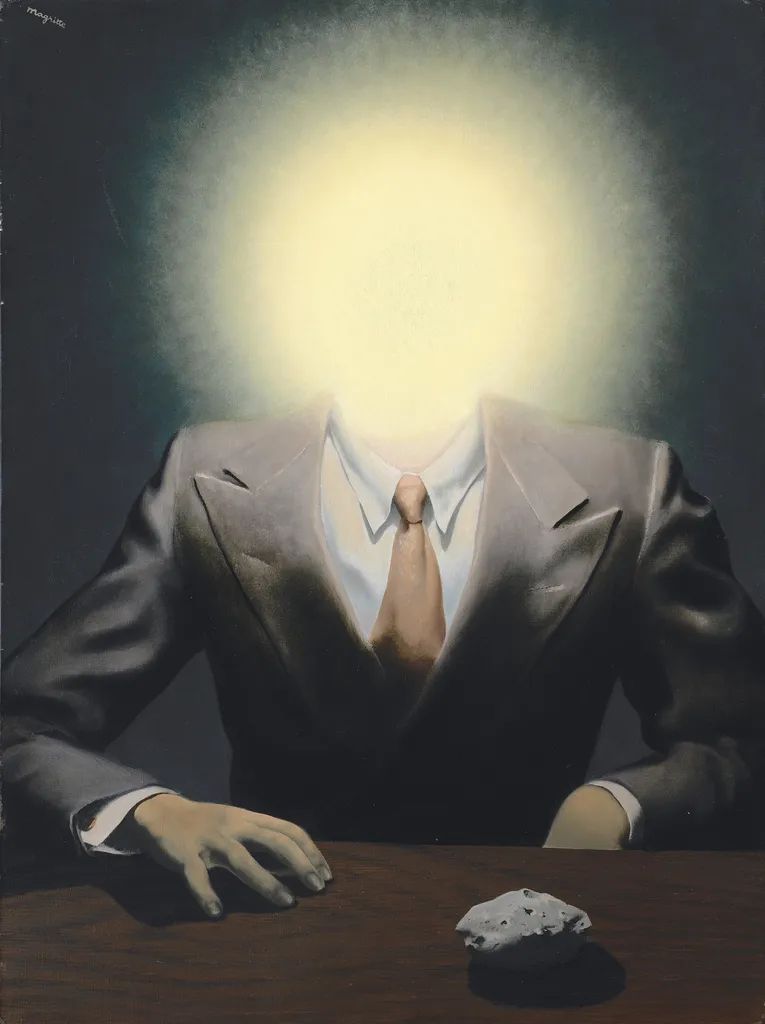 雷尼·马格利特《快乐原则》,1937年作,私人收藏。本作所描绘的正是爱德华·詹姆斯,他坐在桌子后面,头部的位置闪烁着光晕