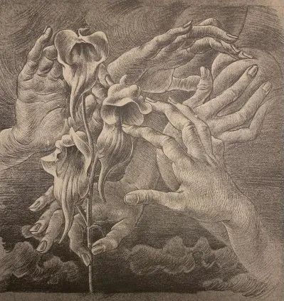 詹姆斯或许是从1938年出版的《超现实主义简要字典》中的汉斯·贝尔默(Hans Bellmer)画作中获得灵感,画中女性的手含情脉脉地抚摸着兰花般的植物。贝尔默的手与花朵充满暧昧——手指捏握、爱抚着花朵,画面右上角的一颗桃子更增强了这幅作品强烈的感官魅力。而马格利特的花朵(以及手)则更为克制,尽管指尖轻触的微妙感带来一丝悸动,这种细腻的触感为画作增添了更多吸引力。