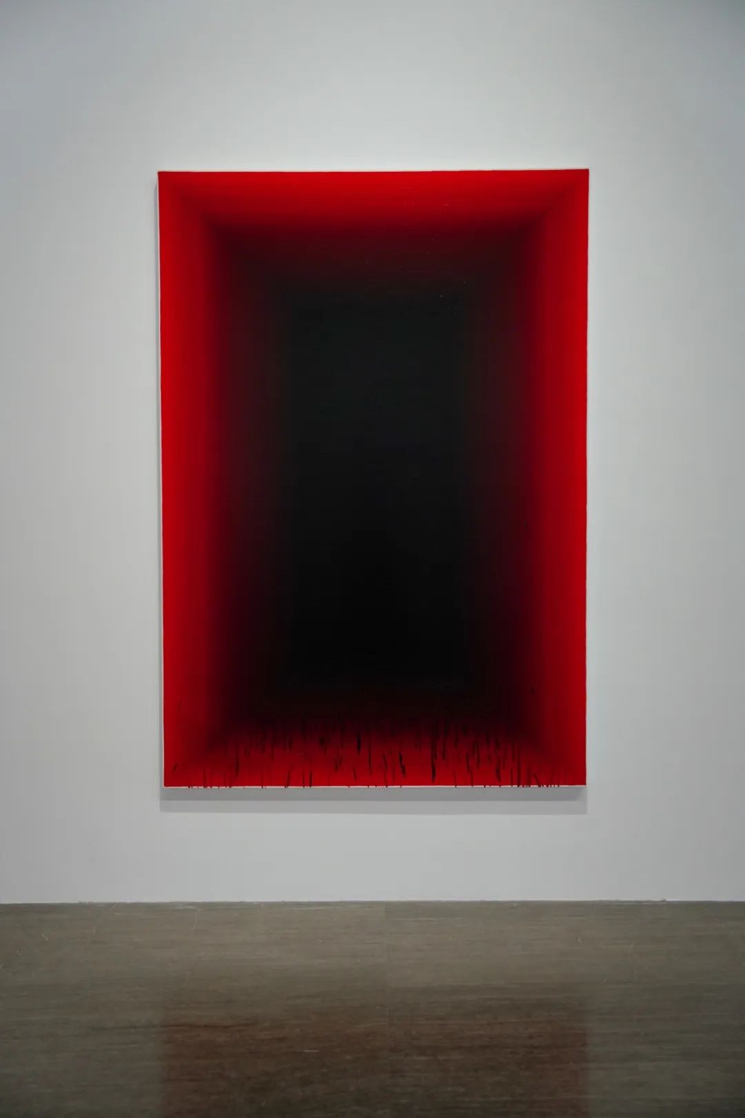 颜料由于重力从上往下流淌,使层叠覆盖不再是从边框往画面中心的平均缩进,画面不再形成视觉焦点,而是呈现至上而下的色彩渐变。