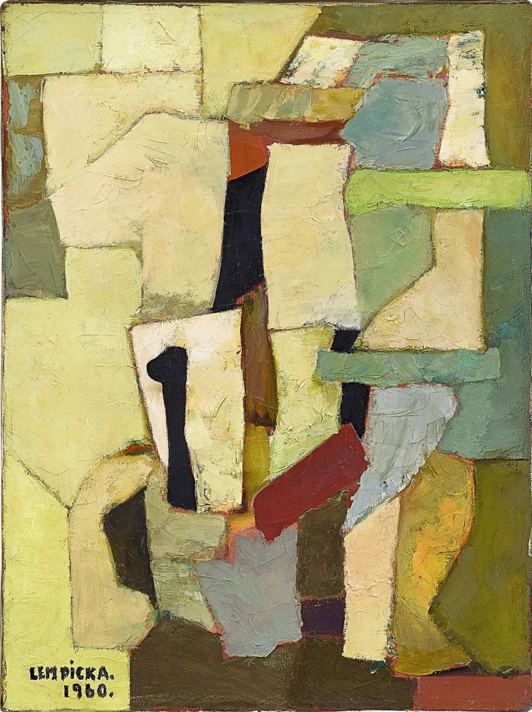 塔玛拉·德·蓝碧嘉曾在1920年代曾居住于前卫艺术派别百花齐放的巴黎,在此,她受到了立体派同行的影响,创作了极具装饰艺术美学的独特肖像画风格。《抽象构图》是艺术家在1959 年至 1960年间创作的一系列抽像作品之一。这个系列代表了艺术家创作方法及风格的转变,她将交错的色块与纯粹构图结合起来,与她的作品中常见的光滑、明亮的肖像风格形成鲜明对比。
