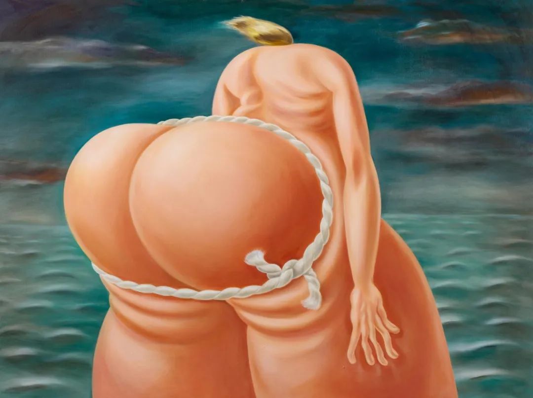 路易丝・伯内特是近年备受注目的瑞士艺术家。她以浮夸极端的人物塑像风格着称,其作品在2022年第59届威尼斯双年展中被重点展示,声名大噪。《捆绑的臀部》规模宏伟,是艺术家迄今拍场上呈第二大尺幅的作品,构图完美呈现了伯内特的创作特征,荒诞的人物形象令人联想起马格利特 (René Magritte) 超现实主义幻化女体的视觉特质。伯内特从阿尔弗雷德·希区考克(Alferd Hitchcock)的电影摄影和辛迪·舍曼(Cindy Sherman)的摄影中汲取灵感,经常如本作般将人物置于灯光强烈的场景中,使人物心理与生理层面的强烈张力跃然于画面,强调了伯内特笔下人物在美与丑、压力与不安、喜剧与僵持之间的不确定性。肉体是伯内特的创作核心,她通过肌肤的束缚和扭曲表达羞耻、失控和被暴露等情绪。这些刻意夸大描绘的躯体成为普及化焦虑的载体,以一种雌雄同体、滑稽铺陈的模样唤起观者强烈的生心理内观及反思。