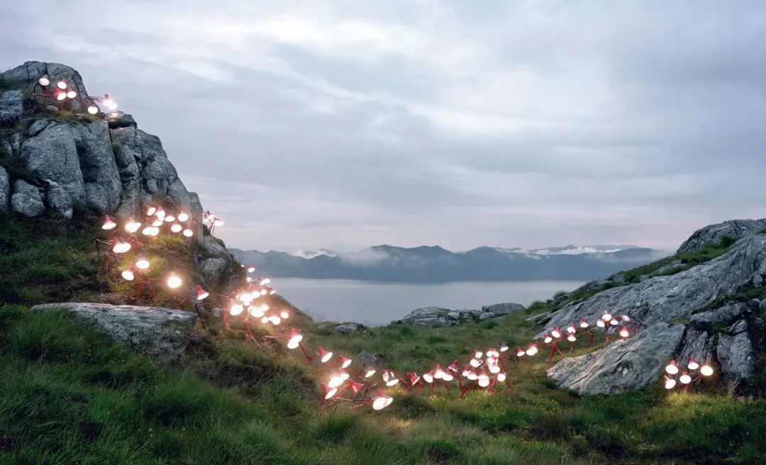 挪威艺术家鲁内·古内里森(Rune Guneriussen)的作品通常是摄影、装置和大地艺术三者的交汇。融入北欧环境特有的诗意、忧郁和温柔,用灯光点亮冰雪与苔原覆盖的无尽长夜。台灯堆叠在偏远山区中,照亮周围繁茂的树丛。荒野似乎因这些家居用品的到来而变得生活化,冰冷的色调也得到了平衡。