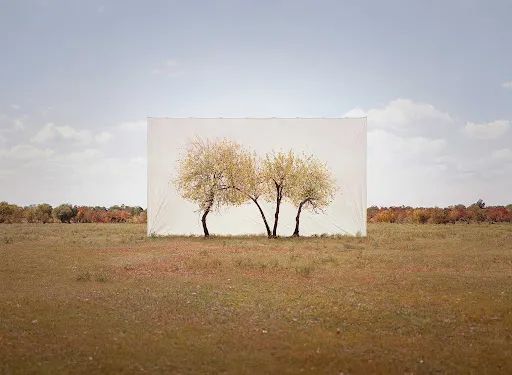 大约从2004年起,韩国艺术家李明浩(Myoung Ho Lee)就开始以一块白布为背景,为树木拍摄肖像照。原本作为自然生态系统组成部分的树木,被压缩成二维图像插入画布,再被摆放到不同的环境当中。这不仅让原本平凡的植物具有了纪念碑式的庄严感,更在重塑现实的过程中创造出超现实的审美体验。