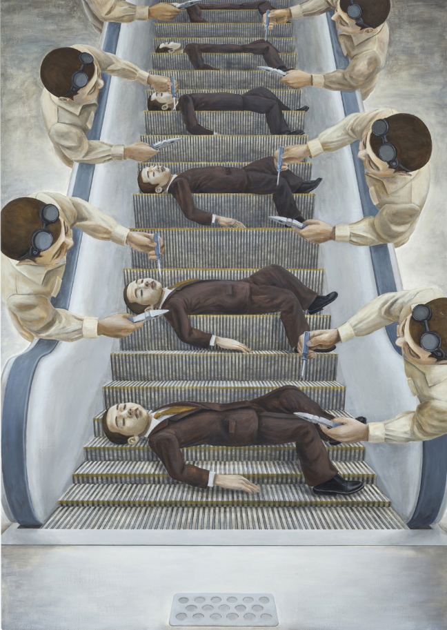 那究竟是什么让艺术如此珍贵?二十年的经验告诉我,答案在人性。艺术从来是人类生存状态的镜子,不仅记录时代,也疗愈心灵。在邦瀚斯任职近四年,我曾策划多场拍卖,见证优质作品如何触动藏家。2024年,草间弥生《无限》以逾4,600万港元成交,红黑交错的圆点与网状图案,是画家与精神疾病长期抗争的生命印记。这份无尽的自我对话,在孤寂的城市中,引起无数人的共鸣。石田彻也的《运输带上的男人》,一名男子躺在自动扶梯上,被机械化的工人们修理。他笔下的世界冷峻而荒谬,却如此真实地映照现代社会的压力与疏离,观者无不感同身受。两年前,曾梵志的《面具》系列以逾2,400万港元高价成交,画中男子戴着夸张的面具,掩饰情感,漫步在沙滩上,淡然地却道尽都市人的孤独。这些作品,聚焦人类最真实的情感,直击人心而历久弥新。
