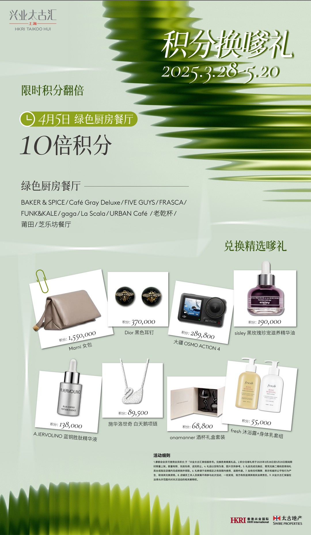 春日季活动期间,兴业太古汇同步开启两场可持续主题的手工坊活动,邀请大家亲手感受废料的焕发新生;WOW STAGE也将于每周六定期上演,通过手碟、颂钵、海浪鼓等不同乐器,带来疗愈类音乐与舞蹈体验,为消费者在繁忙生活中寻得片刻放松。此外,为进一步鼓励可持续行动,兴业太古汇于4月5日联合10余家“绿色厨房”餐厅以及MUJI可持续概念店,共同推出积分翻倍活动,兴业太古汇摩都会会员于指定餐厅内或门店任意消费,即可享10倍积分福利。