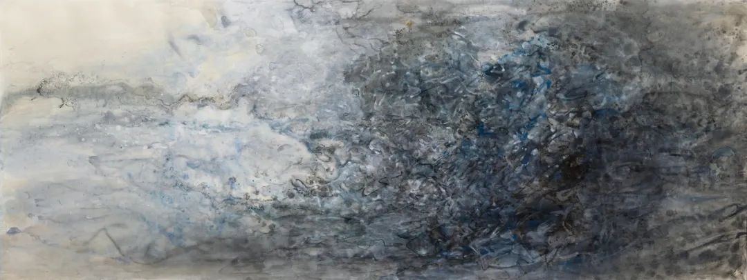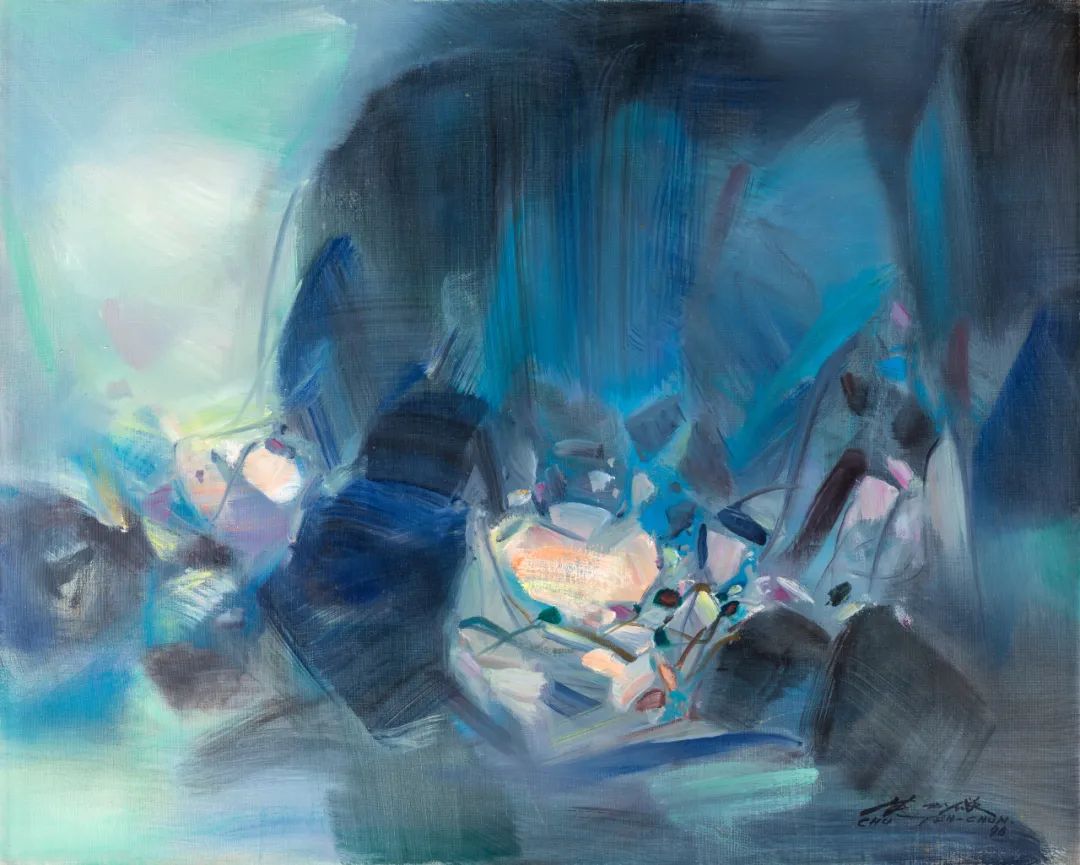 朱德群1996年《温和的展望》与谢景兰1991年《无题》的抽象大作,领衔本场抽象作品。从浅到深的蓝色系,中间绽放出一抹粉红的宝石光辉,朱德群掌握气韵流动,应和著画作主题带入无限想像。谢景兰《无题》一作,彰显这位女艺术家在舞蹈与音乐的造诣,仅仅透过白、蓝、黑三色颜料,画面里的旋转线条细看仿佛舞者,远观则似滚滚大江东去,由浅过度到深,一幅舞动的天地山水就在眼前。