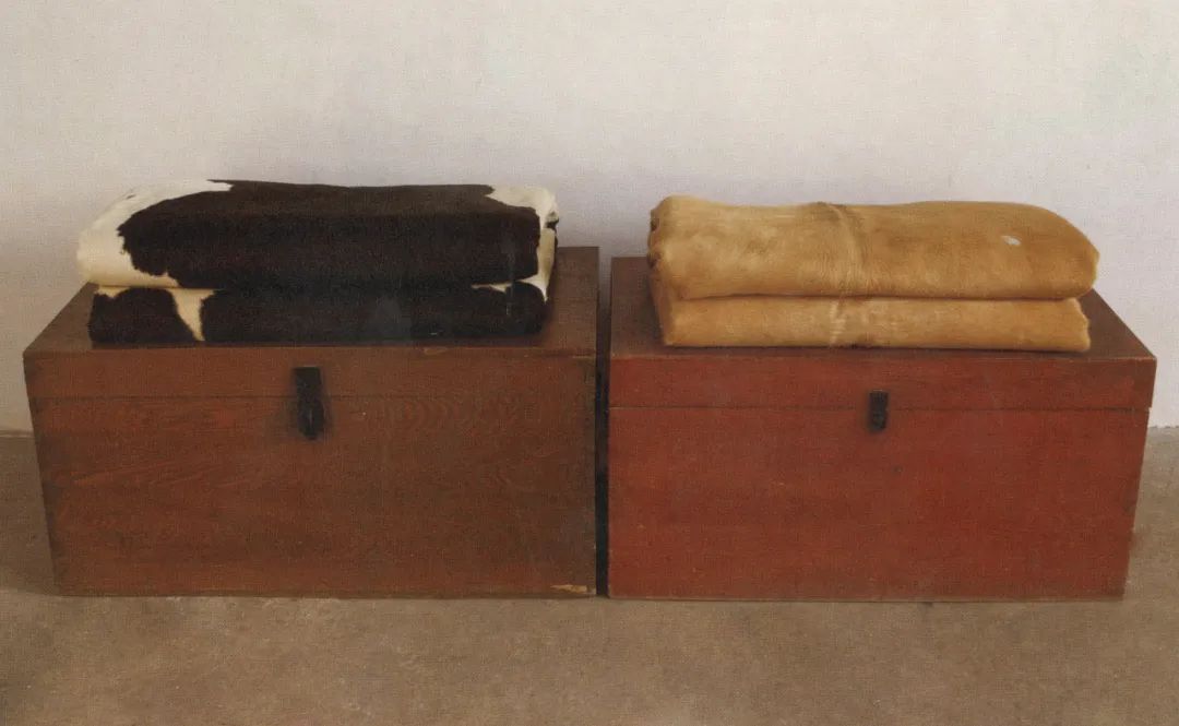 闫冰《棉被》,牛皮、棉花、木箱,尺寸可变,2009 年作,北京泰康空间藏。以真牛皮和家具的原始材料所做的《棉被》,为闫冰2011 年「牛皮」系列的前身,闫冰保留了其创作中的永恒话题:生命与情感,以雕塑般、充满生命力的画笔去描摹牛皮,以此展现出生命表面下更为深沉的精神思考