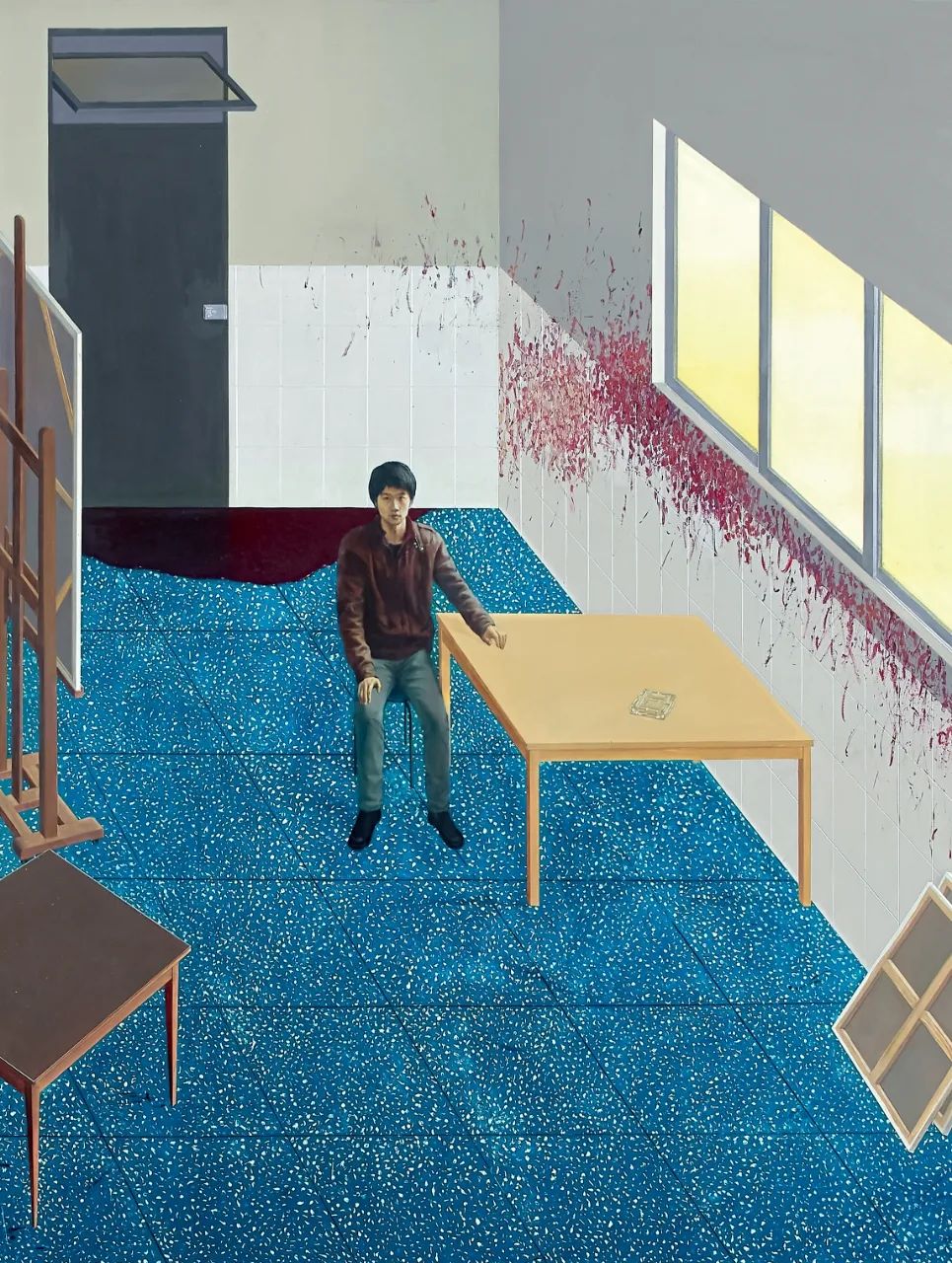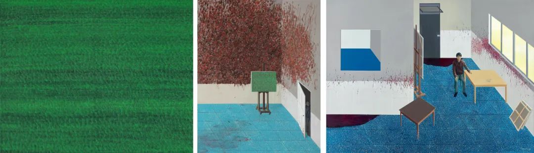 黄一山曾被策展人崔灿灿说是一个「讲故事的人」,其作品之间环环相扣,编织出「故事中的故事」、埸景中的场景。本次呈现尺幅摄人的《有红色颜料的画室》,便为黄一山2010至2011年绘写的「弗洛伊德」主题作品中,极具自传色彩的压轴篇章。在绘画此作的前一年,黄一山先创作了《草地》与《堆满顔料的画室》两件作品。前者以其标志性的平行透视描绘草坪,凝聚了对物料质感的执着的匠心;后者则以画中画的形式将《草地》置于一个画室空间,墙壁上以点状笔触铺满的红色颜料,指涉对中国当代艺术影响深远的英国肖像画家弗洛伊德(Lucian Freud)那溅满颜料的工作室的致敬,而在最终章的本作,黄一山加入并放大了其就读的美院洗手间的蓝色水磨石地砖纹样,将自己身处的环境与弗洛伊德的画室空间交织,并让自已登堂入室,蜕变为「画室的主人」。