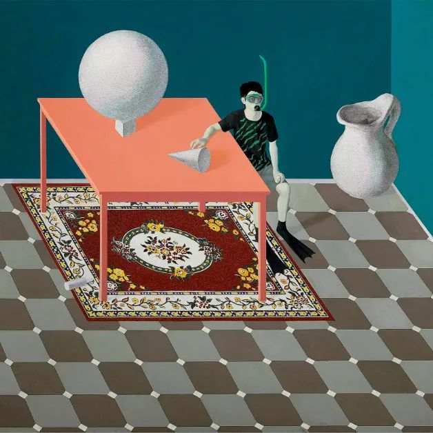 作品以其经典的「轴测图」视角,展示了一个封闭又开放的空间,所有线条、地砖、门窗、桌以极度严谨的方式展现着与彼此的平衡。其以精心调配的特殊顔料在反覆下笔间,营造出具厚度的光滑瓷砖质地。配合严丝合缝的空间逻辑,直指强烈的理性思考,呈现一种近乎「完美的真实」,宣告作者「理性即人性」的宣言。然而那具超现实感的画境,依然瀰漫着虚构感,引人悬念地使之在剧场与现实间游弋。