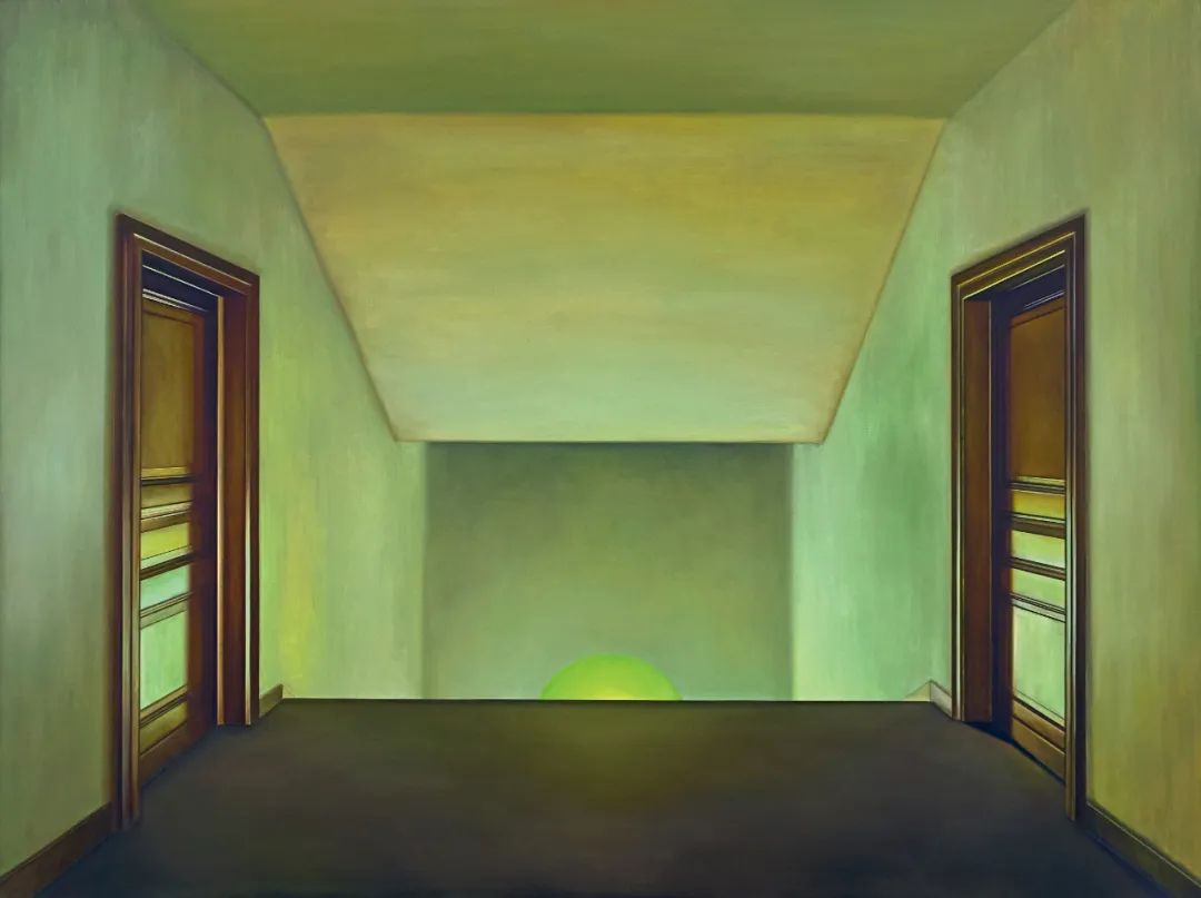 作品带领观者亲临一个散发黄绿微光的幽隐之地,利落规则的线条渲染出平静下的奇峻。画面由中心向外部延展,看似封闭,却透过刻意安排的门、往下延伸的楼梯间和走廊等过度性场所,建构出一个临界空间,打开了四通八达的可能。在这个空间中,一颗光滑的嫩绿色圆球反向由地面探出,犹如海上升明月,暗喻着隐藏于不可见的表象之下的希望,象征无人之境中的人性。作品引导观者的意识意识突破有限空间而追寻无垠的未知,拥抱开放的可能性。