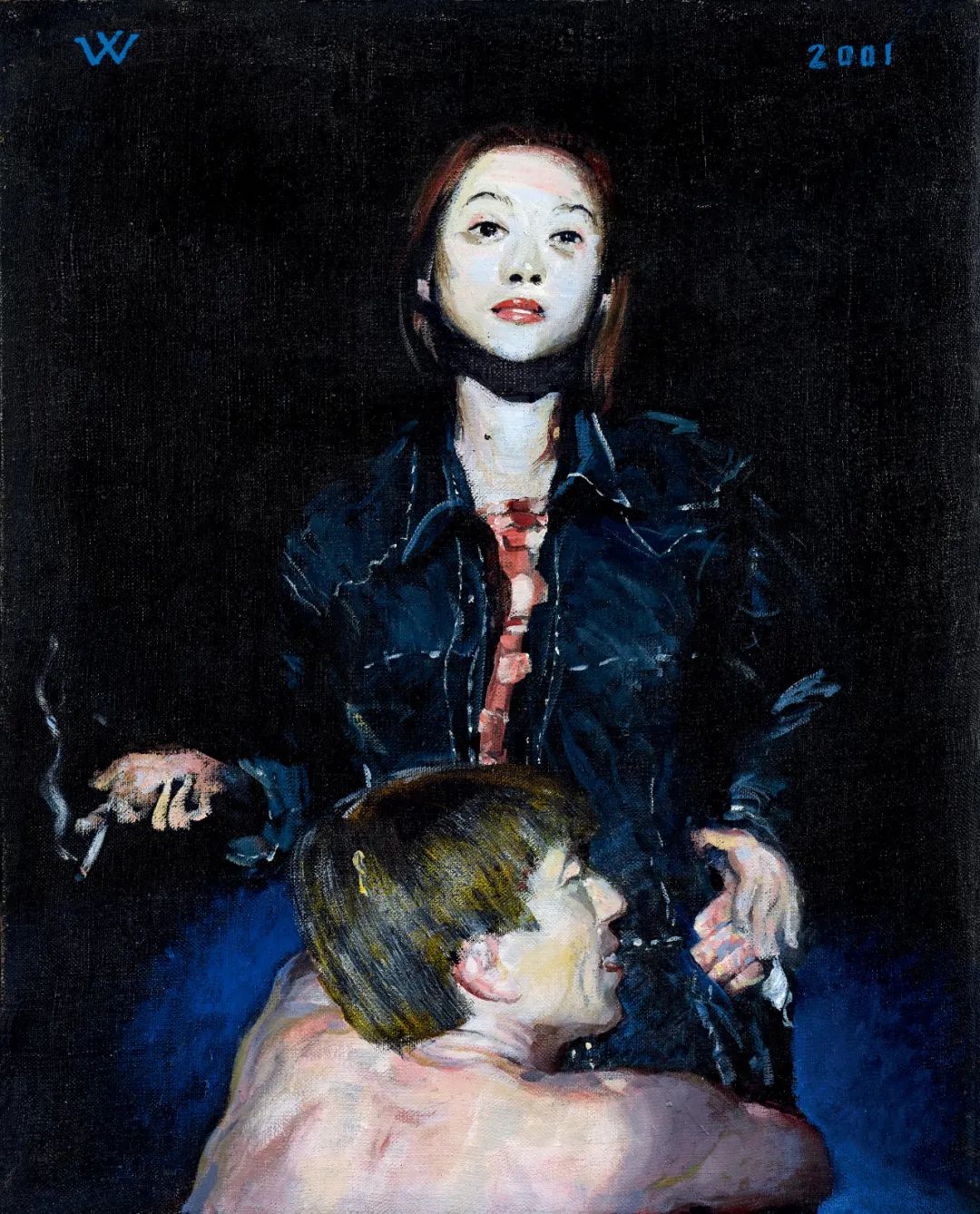 作为中国当代炙手可热的领军人物,王兴伟在创作中常以中国社会背景的日常碎片、热议话题、笑话和故事进行戏剧性的处理,营造出一种如闪光灯下或是舞台上般放大、夸张、直入内心的效果。《无题》就彷若话剧舞台上的精彩一幕。有别于传统向男性的膜拜,作品画面由女性来主导关系,裸背的男子则甘愿成为裙下之臣,环手拥抱女子,脸上露出无所顾忌的窃喜与满足。女子的表情极为漠然,层层堆砌的颜料好似给她带上面具,昂头下撇的眼神、抽烟的慵懒动作、和她覆盖在男子手上正欲推开的手,加诸了几分「落花有意,流水无情」的推拉戏谑,连接起如今网络上赋予此类形象以「舔狗」二字的形容,亦不乏折射女性独立人格的当代面貌,荒诞不羁的冷幽默画面,编织出当下社会的现状和雅俗共赏的风趣。而画作中投怀送抱的男主角,正是艺术家王兴伟本人的形象,他在此兼具了表演者与创作者的二重身份,将自己变成一个「被观看、被议论」的客体。从此角度看,画中女性又或带有缪斯女神的指喻,正被身为艺术家的王兴伟热情相拥,即便经历冷漠、无情,仍将一无反顾地愿为艺术、理想奉献上身心的终极宣言。