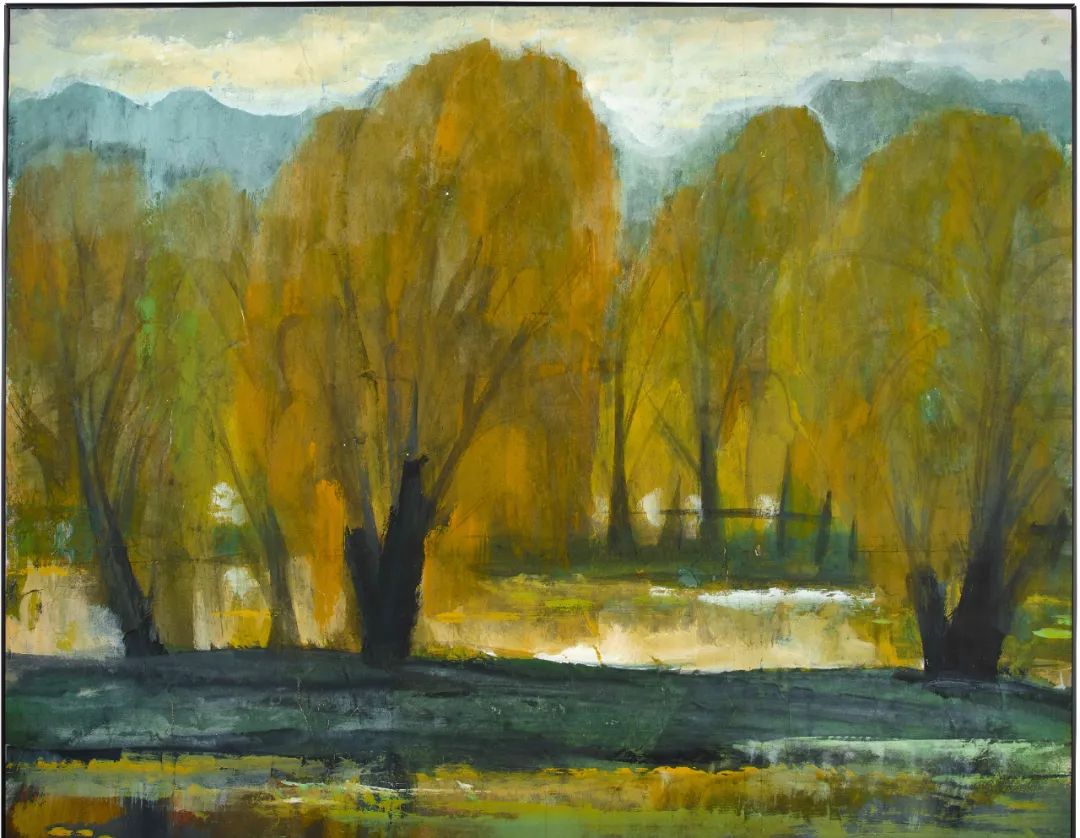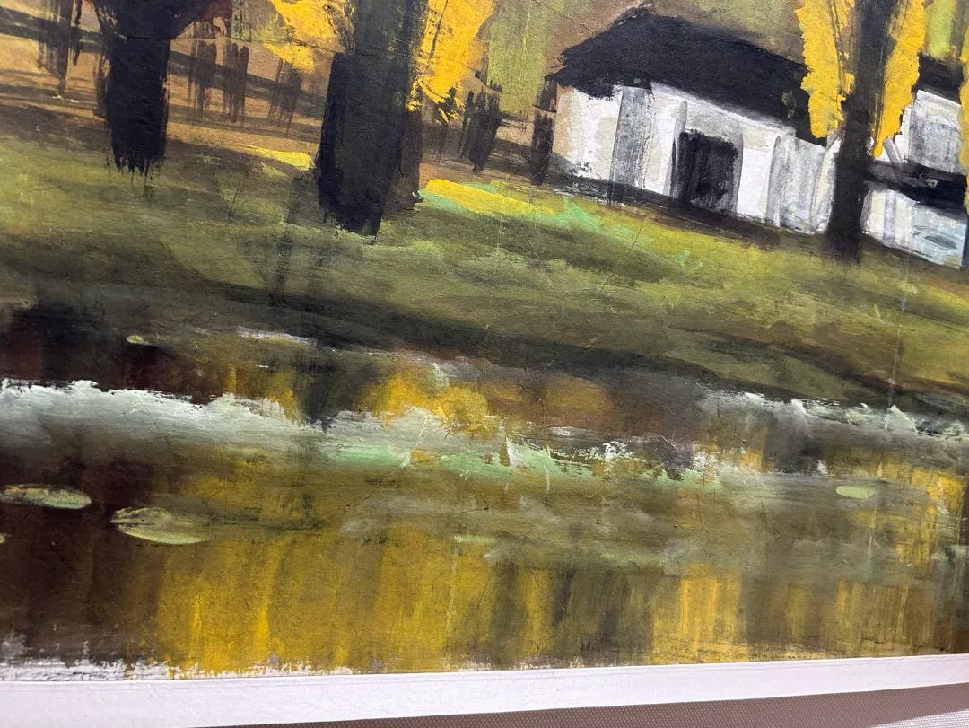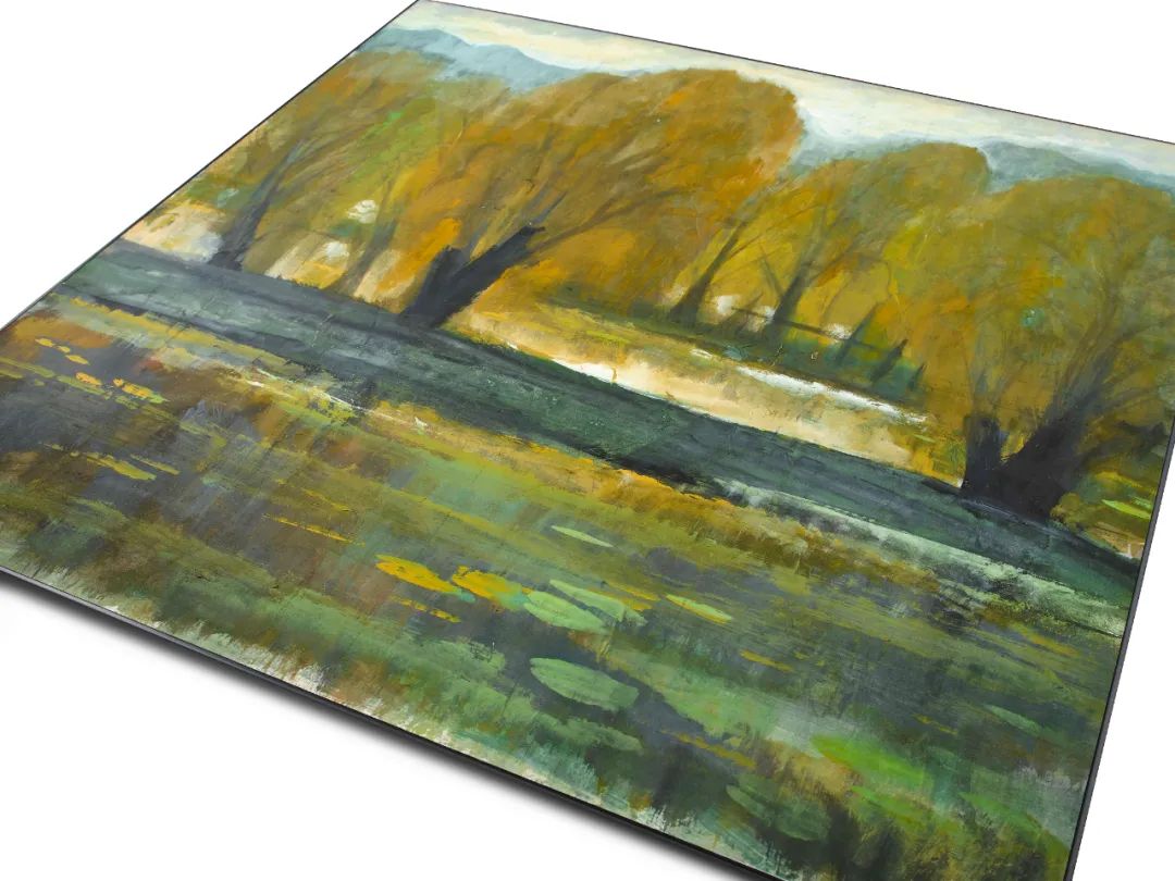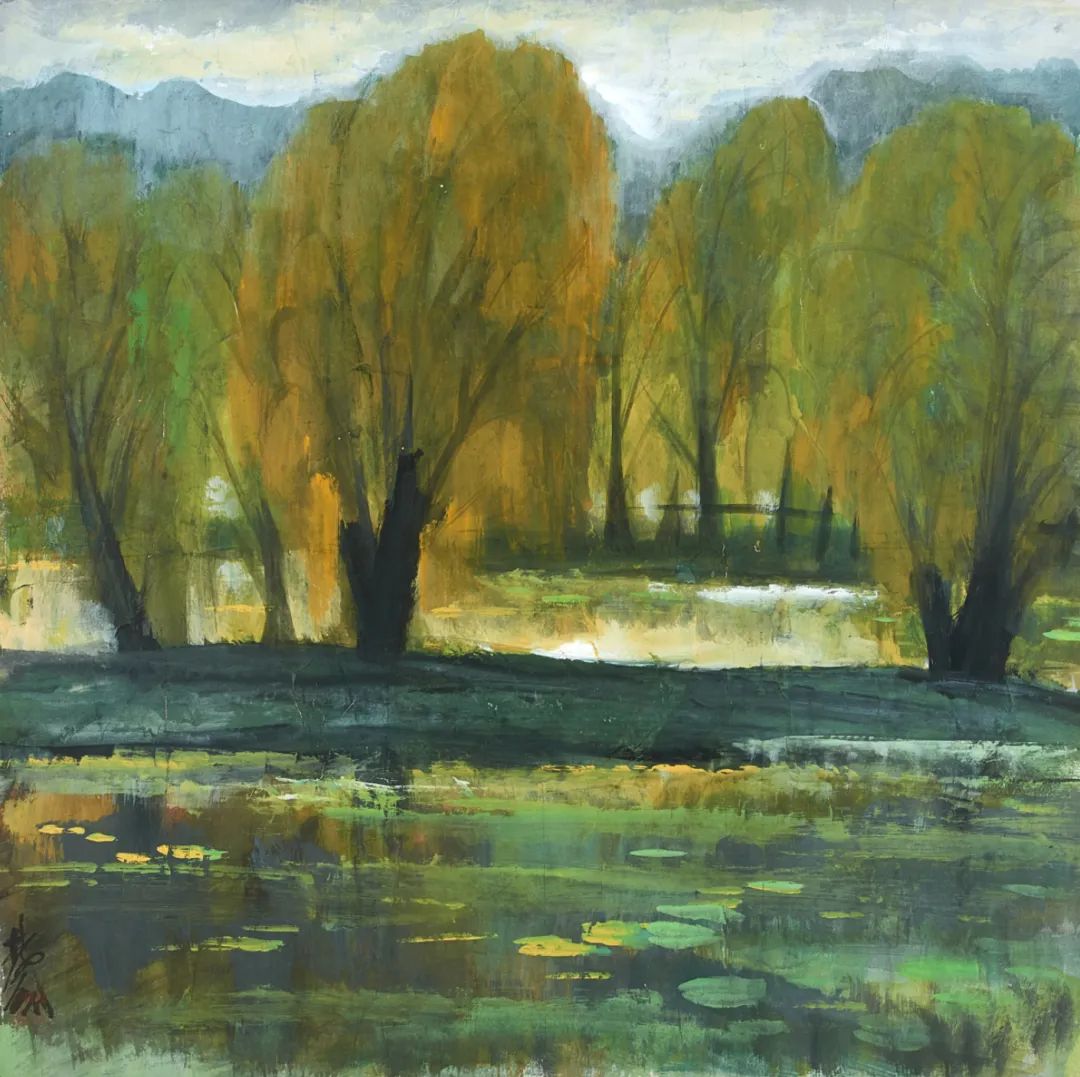 画中岸渚柳树,翠绿带黄,正是夏末转入初秋之时。前景水平如镜,映照岸上树木,与漂浮水面的荷叶相辉映。背景见蓝天白云,画家取油画般之层层厚重颜料,光影、色调的处理恰到好处,呈现温婉阳光下,景物丰富而浓郁的色彩变化。
