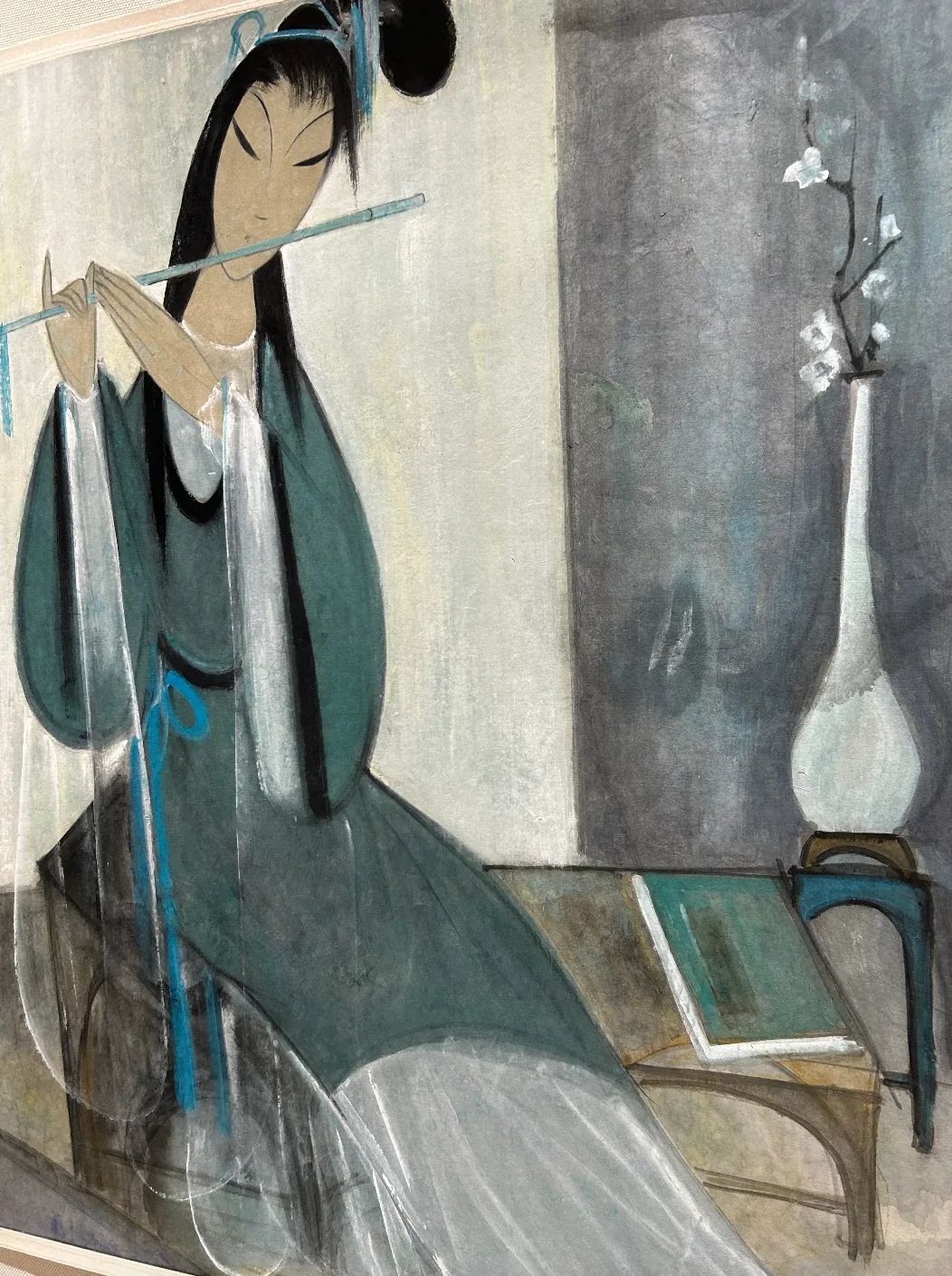 本幅写坐姿鸣笛女子,气质温婉,几凳置放书本,玉壶春瓶插白梅,彰显东方典雅之美。用色素净,线条、物象洗练,遵循西画之构成法,大处直线纵横,辅以小曲线丰富细节,画面简约凝炼。帷幔、墙面的暗影,与窗户透出的光感、花瓶及衣裙薄纱的高光,形成光影的反差,集水墨之古典韵味与西画之美学形式于一体。