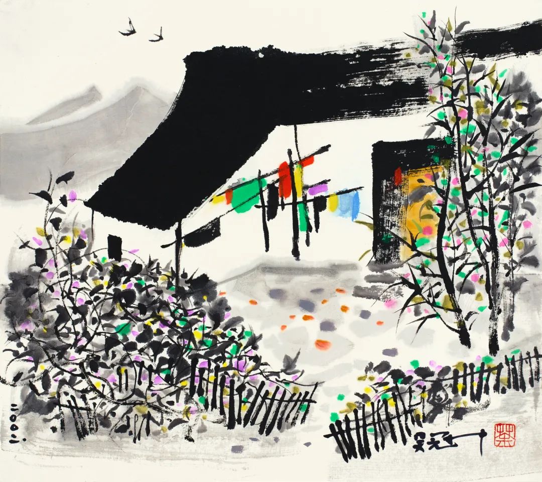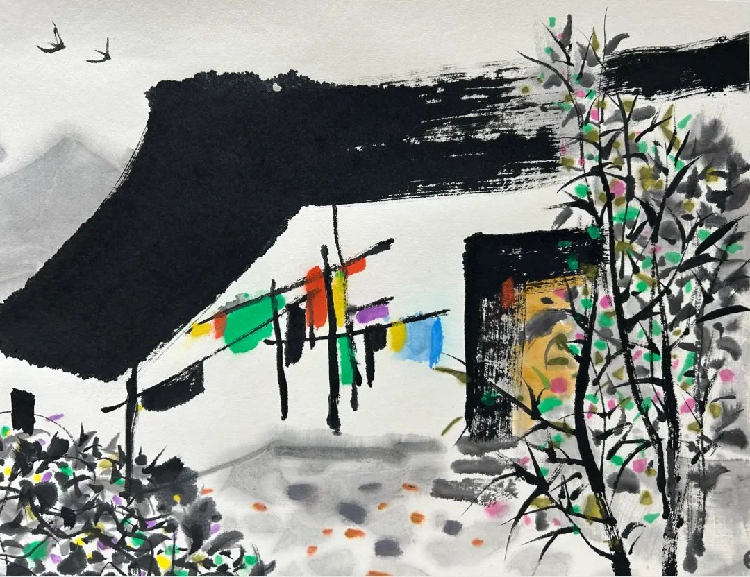 农家田舍小巧规模,造型却自得天趣。只见黑顶白墙坐镇院中,晾晒衣物七彩如画,妆点桑麻日常。当门一树春桃,姹紫鹅黄绕篱,挺拔与交缠的枝叶互衬,复置斜歪的篱芭,别具质朴的生活气息。柴门无掩客自来,双燕翩至,当是丰年农家乐事多!