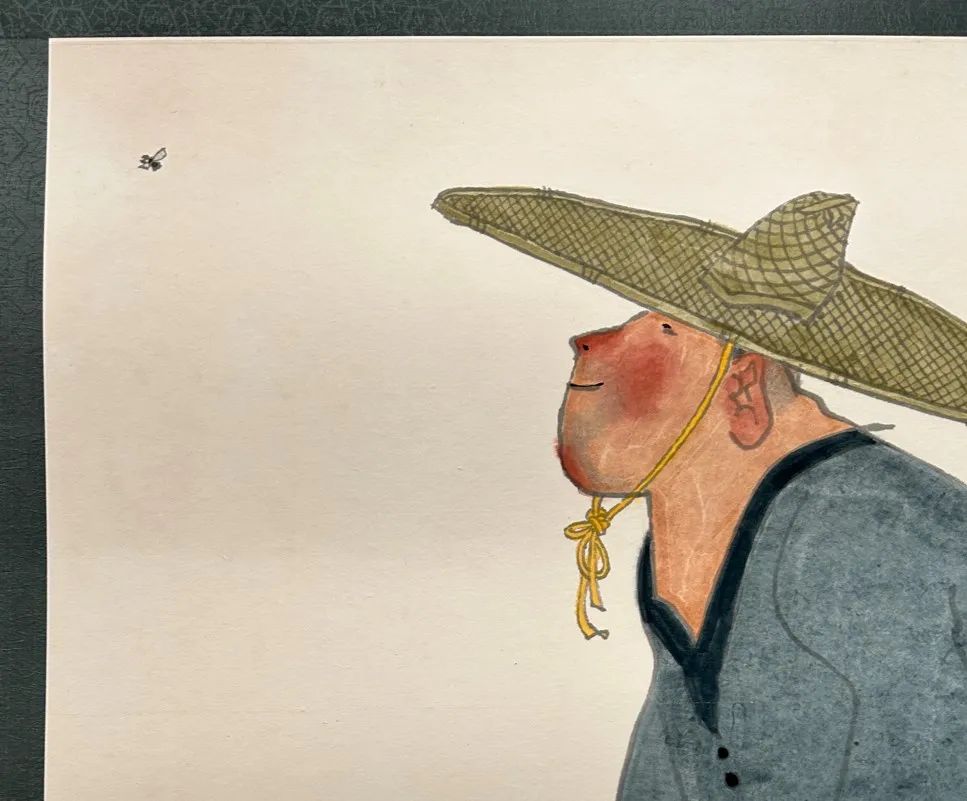 俳句,日本古典诗,短小精美,意境绵长。本幅题句源自江户时期著名诗人小林一茶(1763-1828),诗题「归庵」,原句为「笠上的苍蝇,比我更早地飞进去了」。小林氏视万物为友,苍蝇亦在其列,屡咏之。黄永玉赏其温情而富谐趣,难怪取笔下鲜见之苍蝇入画了!
