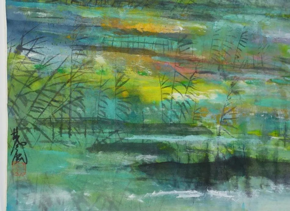 吴冠中少小离家,毋忘故乡苇塘,儿时捕雀其中、躲避炮火,满载悲喜忧乐,然而往昔难复,苇塘何寻?二○○四年,画家大病方愈,对人生尤多感悟,下笔愈见豁达。本幅取景,按同年速写稿题字,可知乃渤海沿岸唐海湿地。一岸芦苇浓密而修长,延绵消失于视野,茎叶随风律动,利落弧线与阔叶块面疏密交织,密中见序,与木桥的几何直线鲜明对照。画幅大胆采用近单一色调,透亮的银灰中现赭红苇花,设色固然切合秋冬景象,更有「洗尽铅华」之慨,体现画家暮年谓「人间的诱惑、顾虑统统消退了,青年时代的赤裸与狂妄倒又复苏了」,撷青春与迟暮之美于同一画面。世事沧桑,惟真情毋改,此心安处即苇塘。「祝君一路安宁」,自是画家对白首生涯的期许与肯定!