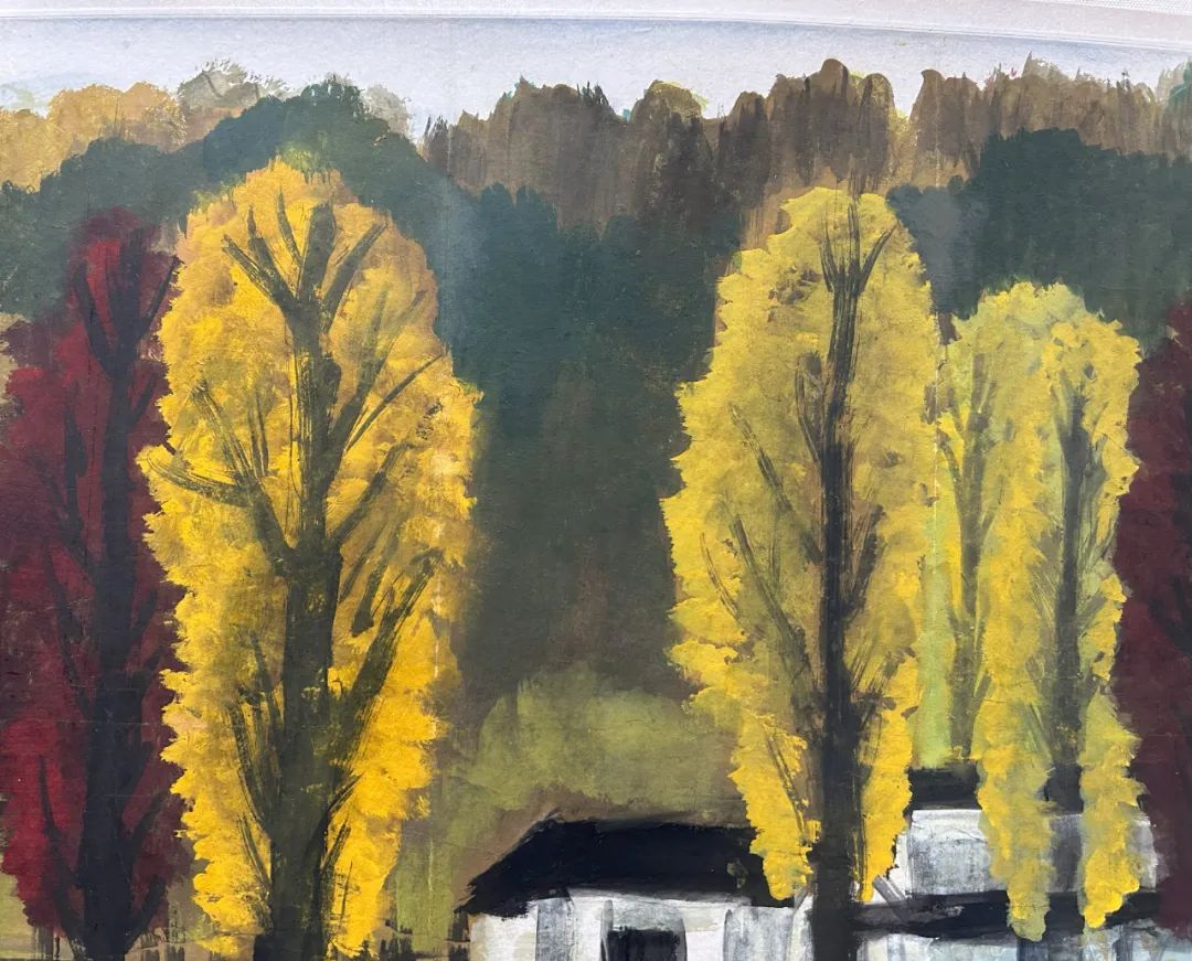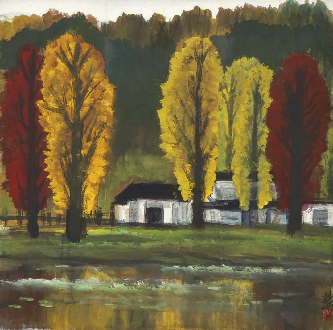 本幅写层林尽染,红黄相间,秋意正浓。凉风吹过,打破寂静,在水中翻起朵朵浪花,为画面增添动态和生机。背景用重色,反衬树木、屋舍之明亮,对比强烈。整体氛围在斑斓与沉静中实现平衡,传达出秋日深林的幽谧肃穆之美。