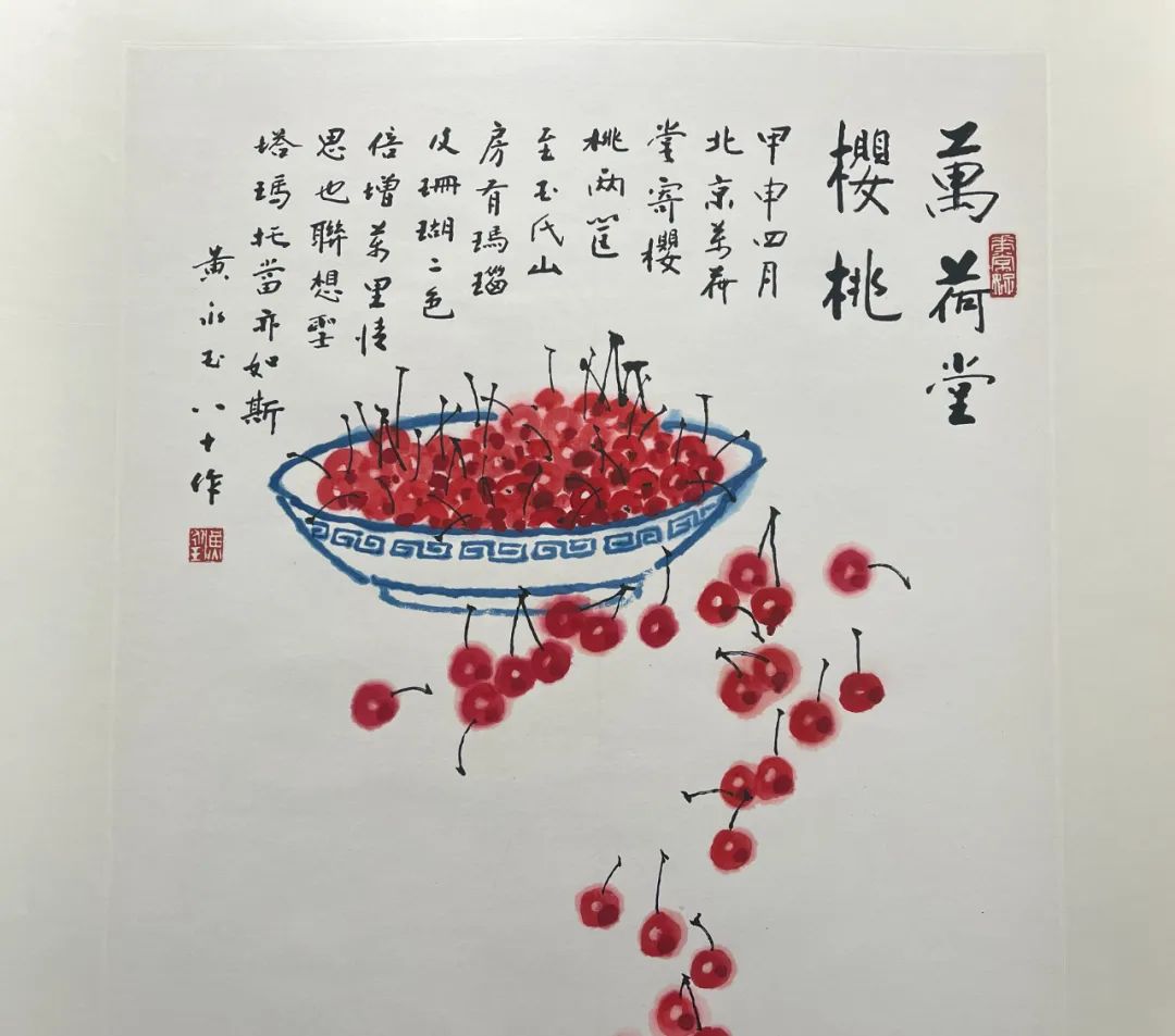 「万荷堂」即黄永玉北京居所,院内栽樱桃树,画家尝谓:「万荷堂樱桃无肆上樱桃大,亦无肆上所售之甜,然自己院中者滋味远在甜大之上矣」。二○○三年,家乡湖南凤凰县之新居「玉氏山房」落成,收到遥寄自北京的樱桃,忆念意大利圣塔玛托山家中果园,遂写本幅,点滴滋味画中毕现矣。