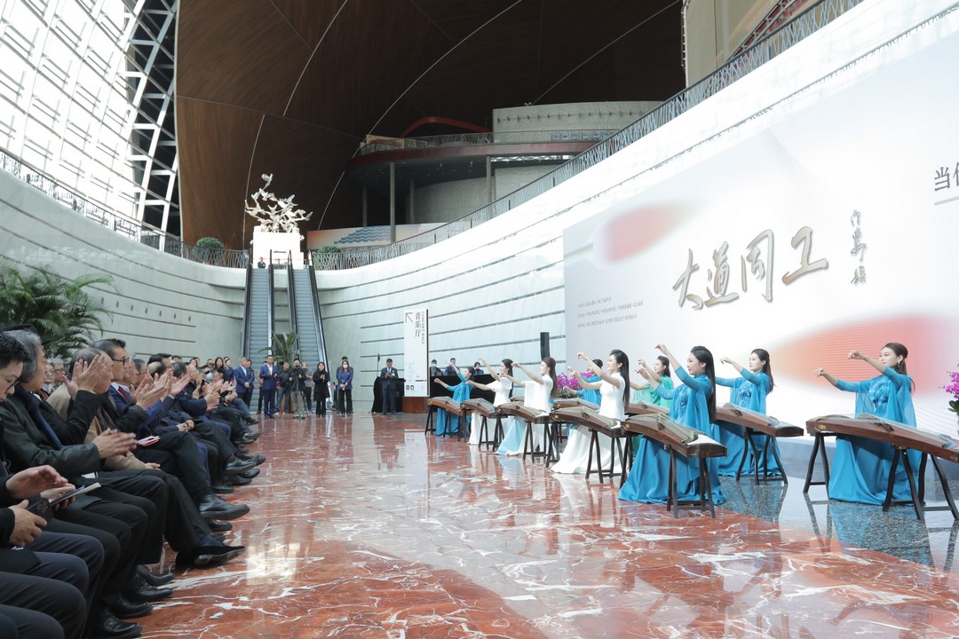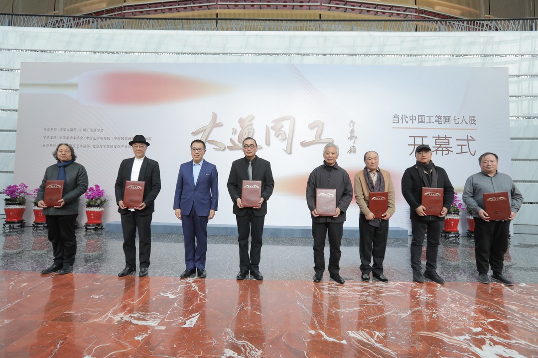 3月31日下午,由国家大剧院、中国工笔画学会联合主办的“大道同工——当代中国工笔画七人展”在国家大剧院橄榄厅举行开幕仪式。国家大剧院副院长王斑,中国工笔画学会会长、中国美协中国画艺委会副主任陈孟昕,全国政协委员、中国国家画院院长、中国美术家协会副主席、参展画家代表刘万鸣,本次展览策展人、北京画院院长吴洪亮,本次展览总策划、中国美术家协会主席范迪安等领导与嘉宾出席了开幕仪式并发表致辞。开幕仪式上,国家大剧院院长王宁为七位参展画家颁发捐赠证书。原文化部党组书记、部长蔡武,中央党校(国家行政学院)原常务副校(院)长、第十三届全国人大社会建设委员会主任委员何毅亭,中宣部原副部长、中国文联原党组书记胡振民,国家大剧院院长王宁,中国美协主席范迪安共同为展览揭幕。