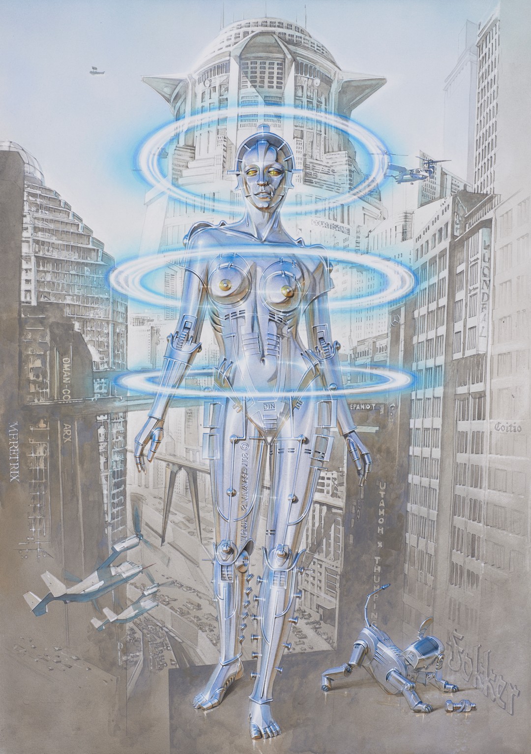 本次展览中,还可以看到1978年空山基为威士忌广告首次绘制的机器人作品、成为了摇滚乐队Aerosmith专辑封面的传奇女性形体机器人作品、机械恐龙和独角兽等追求机械造型的最新绘画作品。搭建在户外的12米高巨型机械姬也是本次展览不容错过的亮点之一,这件雕塑作品曾于2018年在DIOR秀场上登场。