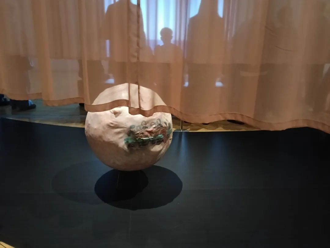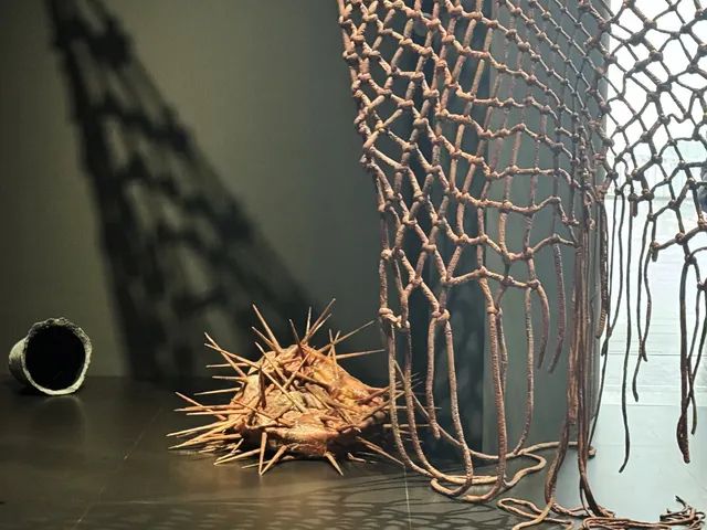 进入展厅,首先映入眼帘的是一张形似纠结的肠子的网。这件作品在空间上体现了作者不断探索的内在与外在的动态过程。尹智英说:“心与行从来都不是分离的,而是相互影响的。”艺术家通过雕塑形象地展现了身体疼痛引发心理问题,然后心理又以行动形式表现出来的过程。这件作品还引出了身体内部的深层感觉,引导观众去接触一个人的私密部位。这一观点也体现在展出作品《曾经有一段时间,我不知道如何活下去,我取出自己的肠子,做了一张网》中。