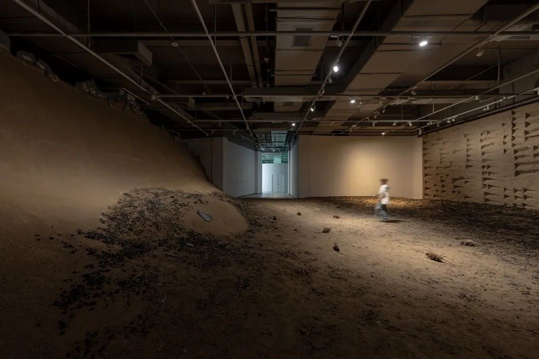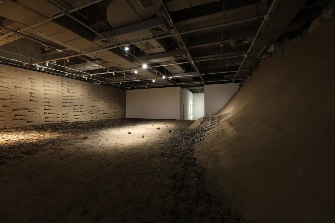 除架上作品外,本次展览特别呈现“苏美尔徊响”系列的特定场域大型装置。在两百平米的空间中,艺术家“重现”了古苏美尔文献中记载的类似核爆炸的遗迹,多种媒介的结合将传说中的场景转化为令人身临其境的“真实”空间。