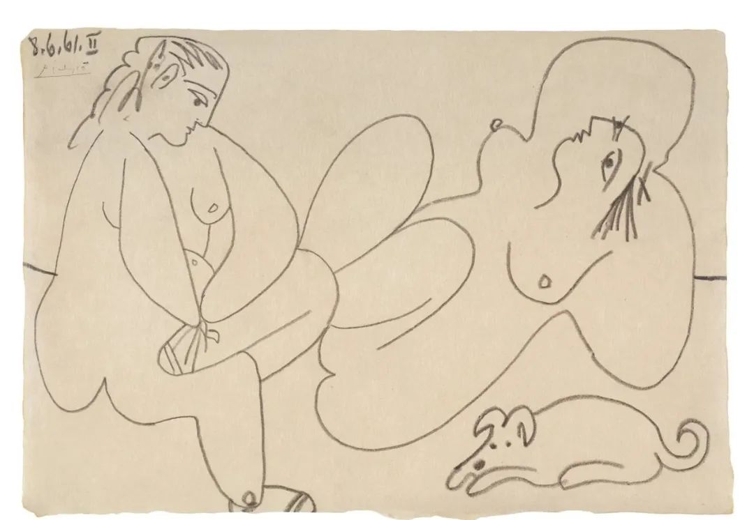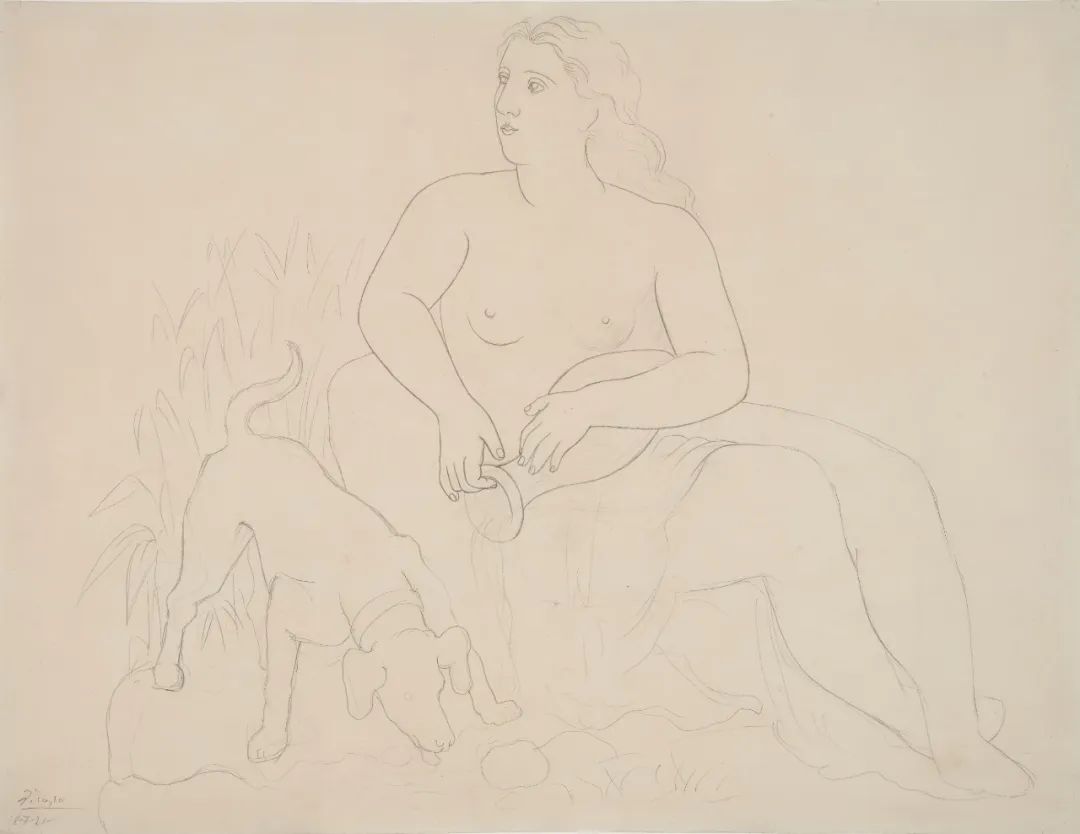 1921年创作的铅笔画作《泉水、女子与狗》反映了毕加索在一次世界大战之后对古典主义的回归,曾被纽约现代艺术博物馆(MoMA)纳入收藏。画面中,一位坐着的女子正在为陪伴她的狗倒水,并同时为河流提供养分。