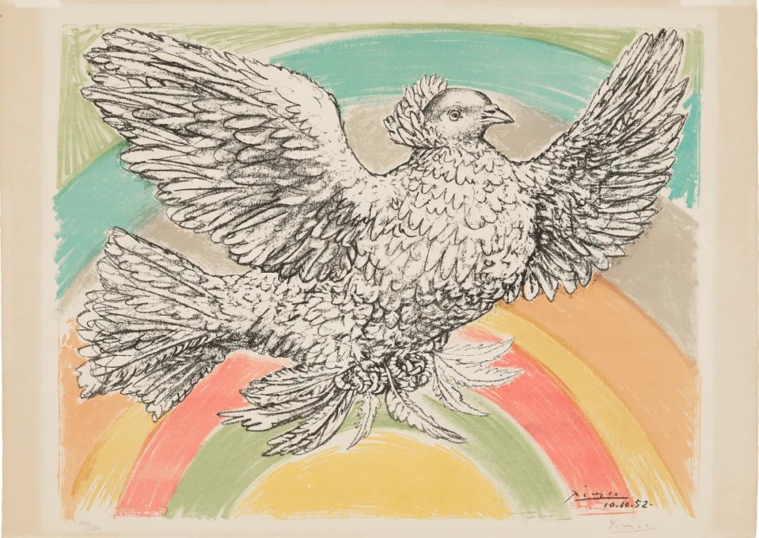 1949年,巴黎世界和平大会委托毕加索设计宣传海报,他选择绘制一只白鸽——灵感源自父亲曾在家中饲养的鸽子,也是他童年记忆的温柔符号。这幅简洁的版画海报迅速成为和平运动的全球标志。