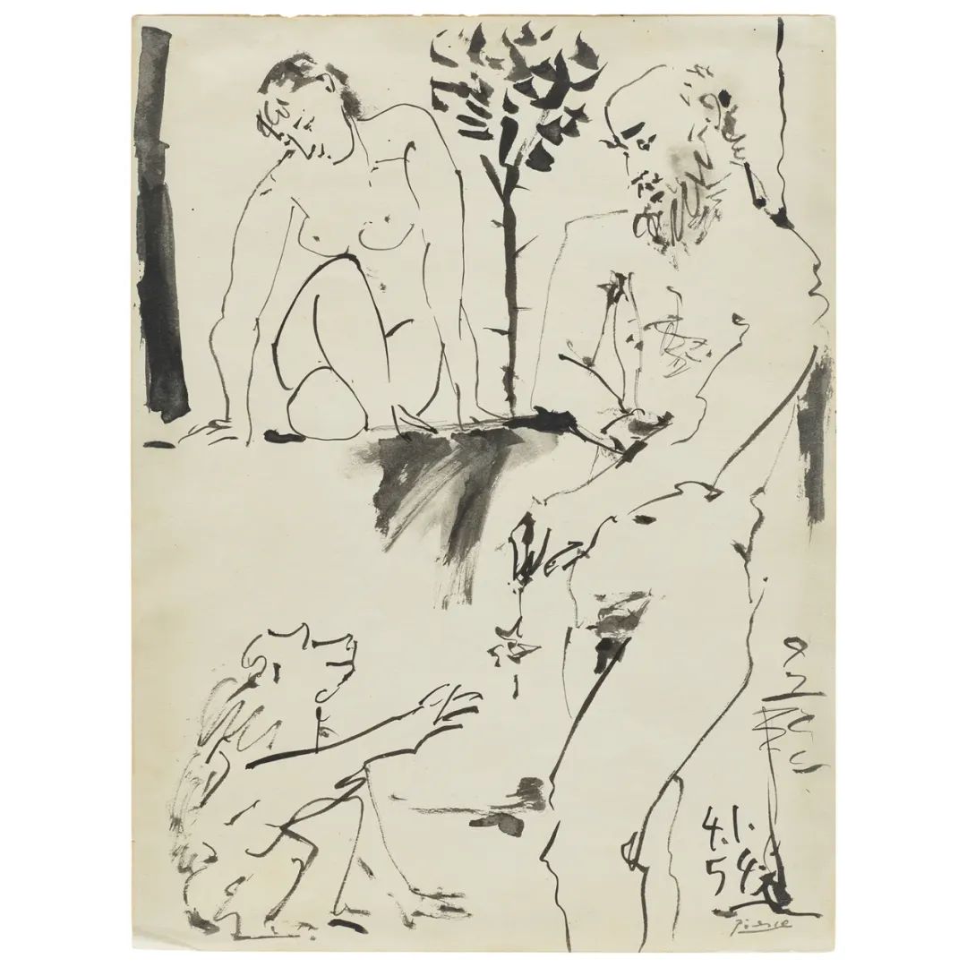 在毕加索75岁创作的《女人与猴子》中,艺术家以黑色墨水与游刃有余的笔触勾勒形体。画中女子、男人与灵猴的肢体被解构为流动的曲线与三角块面——这种矛盾张力正是毕加索对“人与自然”的诠释;他用孩童涂鸦般的简练线条,将灵长类动物的狡黠智慧与人类的情感温度熔铸于同一视觉磁场,让野性与文明在撕扯中达成平衡。