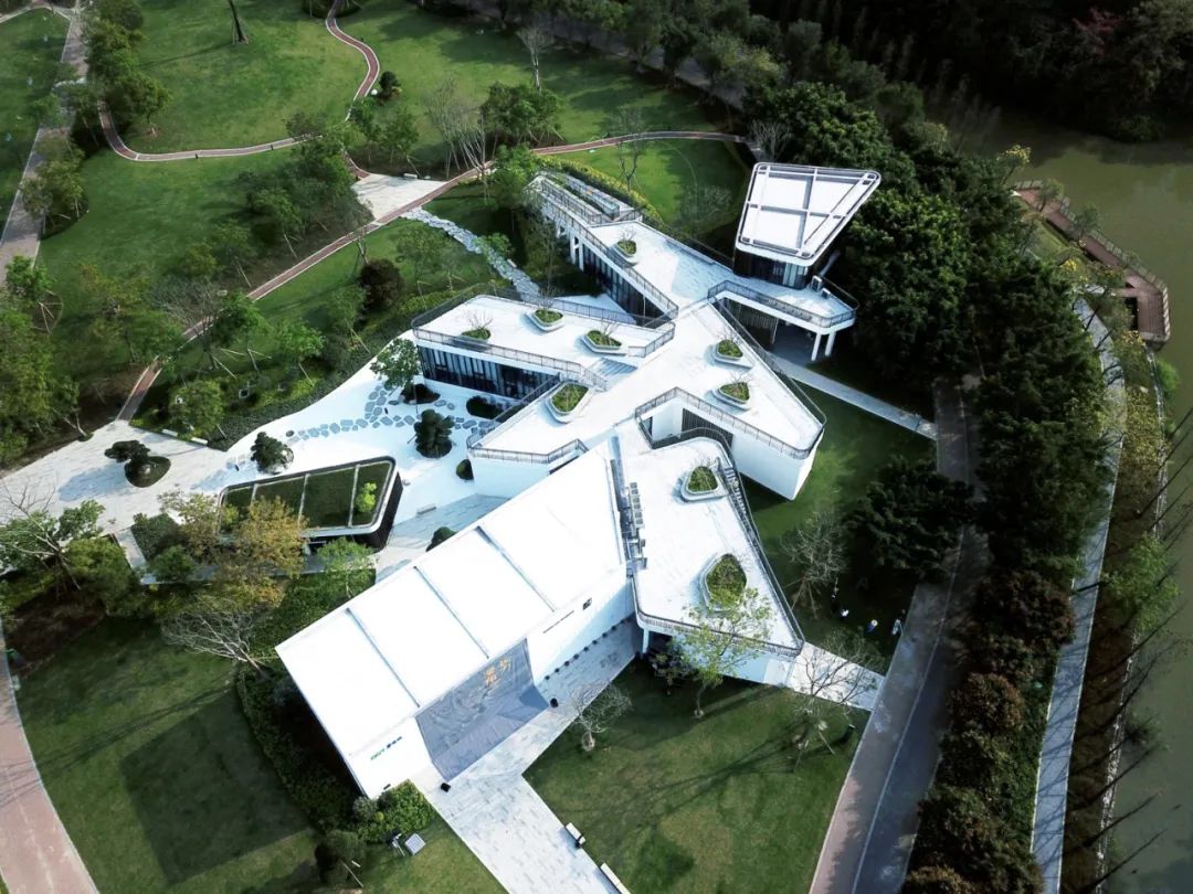 美术馆建筑面积约5135平方米,设置了9个展厅及2个驻留工作室,在保有原建筑整体性与设计意图的基础上改造与升级,如半开放式的艺术容器嵌入松山湖,自然与艺术在场馆内外流动。